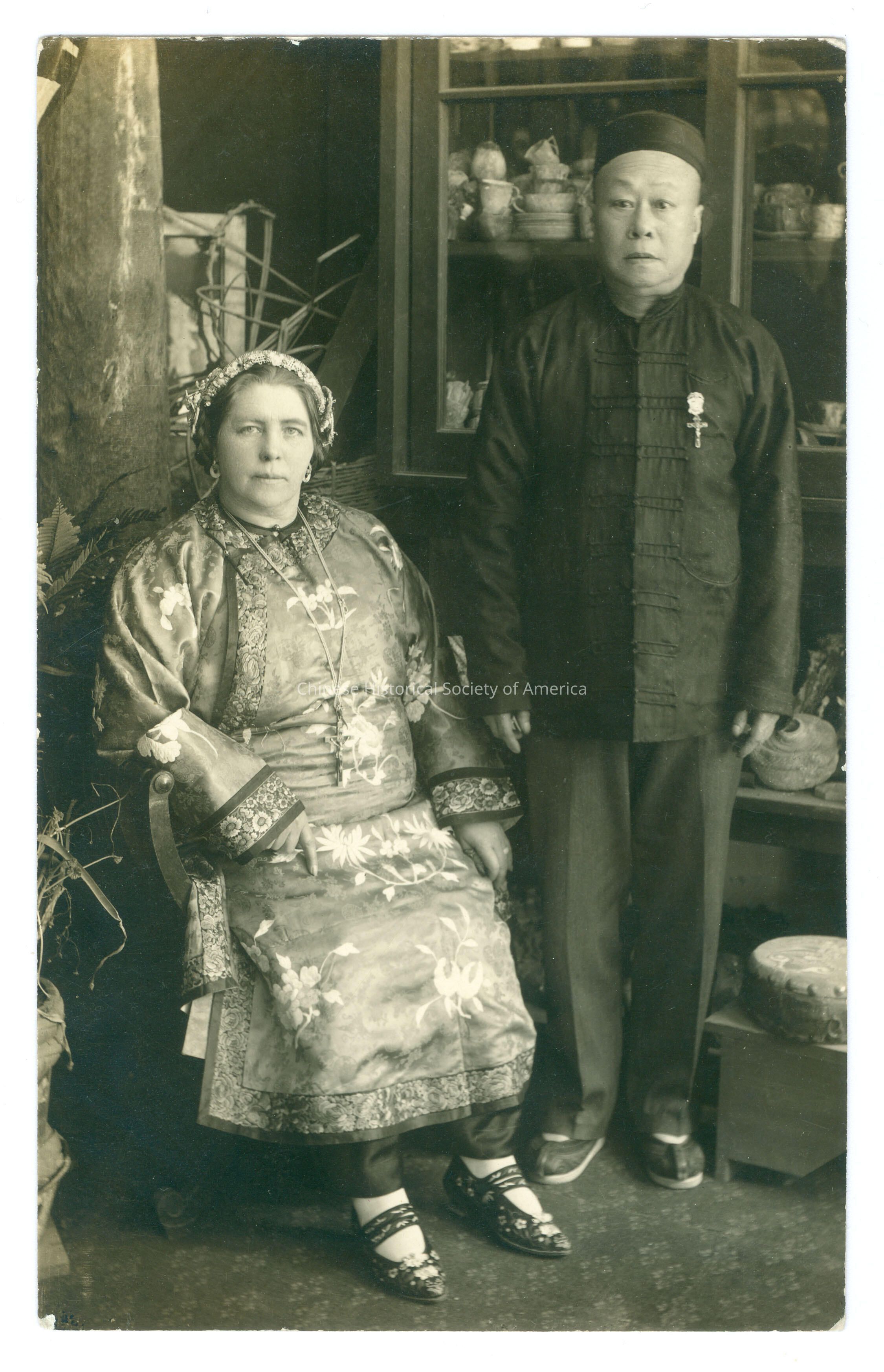 CHSA-04422 A-B. B&W. Photo. SF; Mrs. and Mrs. Wong Sun Yue Clemens: A-B: A Chinese man is standing with a cross pin on his chest, he's next to a White woman in a Chinese dress sitting in a chair, behind them are display cabinets with cups and pots.