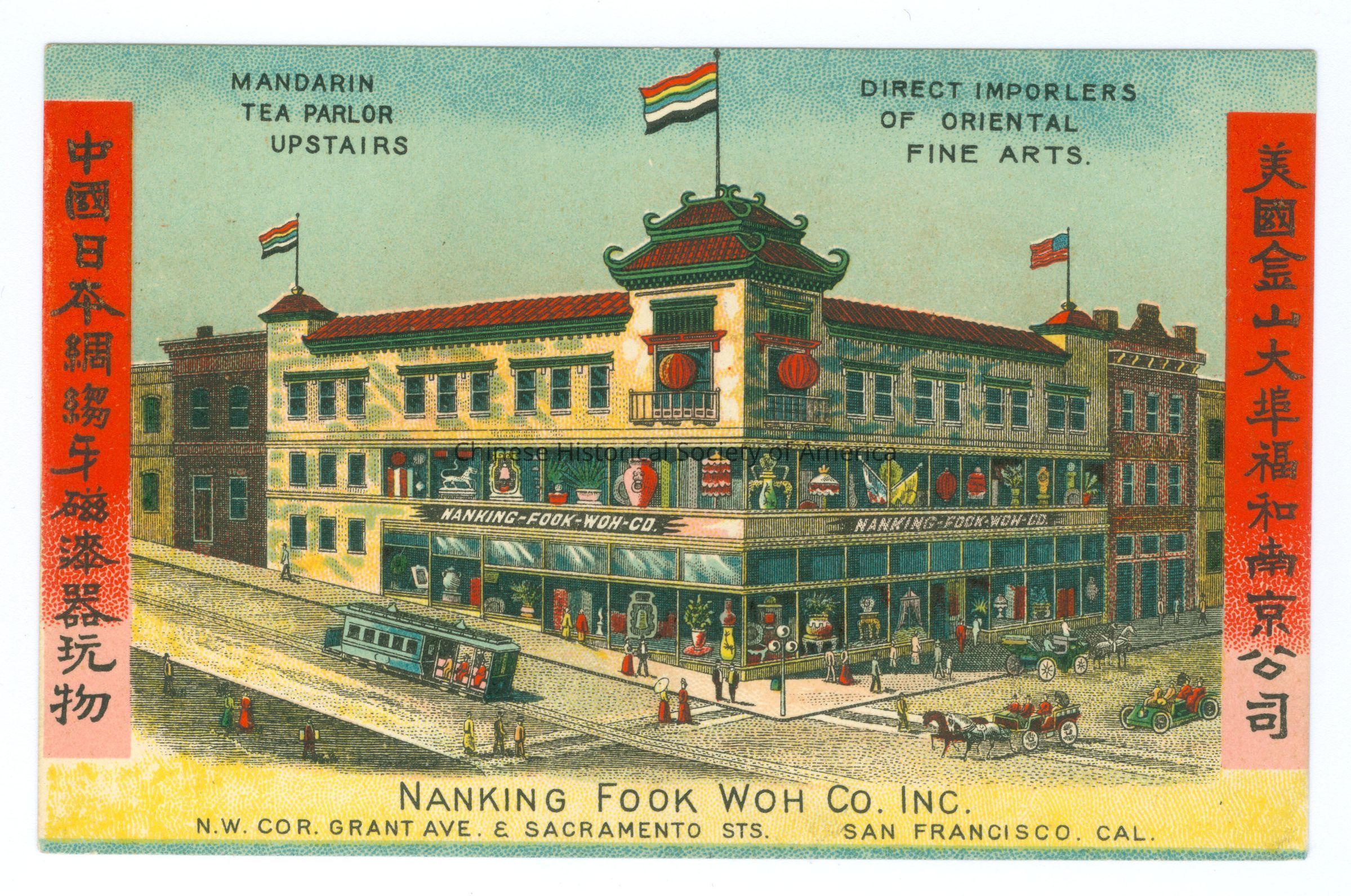 A: Front: Caption: "Nanking Fook Who Co. Inc. N.W. Cor. Grant Ave. E. Sacramento Sts. San Francisco. Cal." "Mandarin Tea Parlor, Direct Imporlers Of Oriental Fine Arts." There are Chinese characters on either side of the postcard. Back: Message: "Chinatown visited Sat. June 30, 1917"