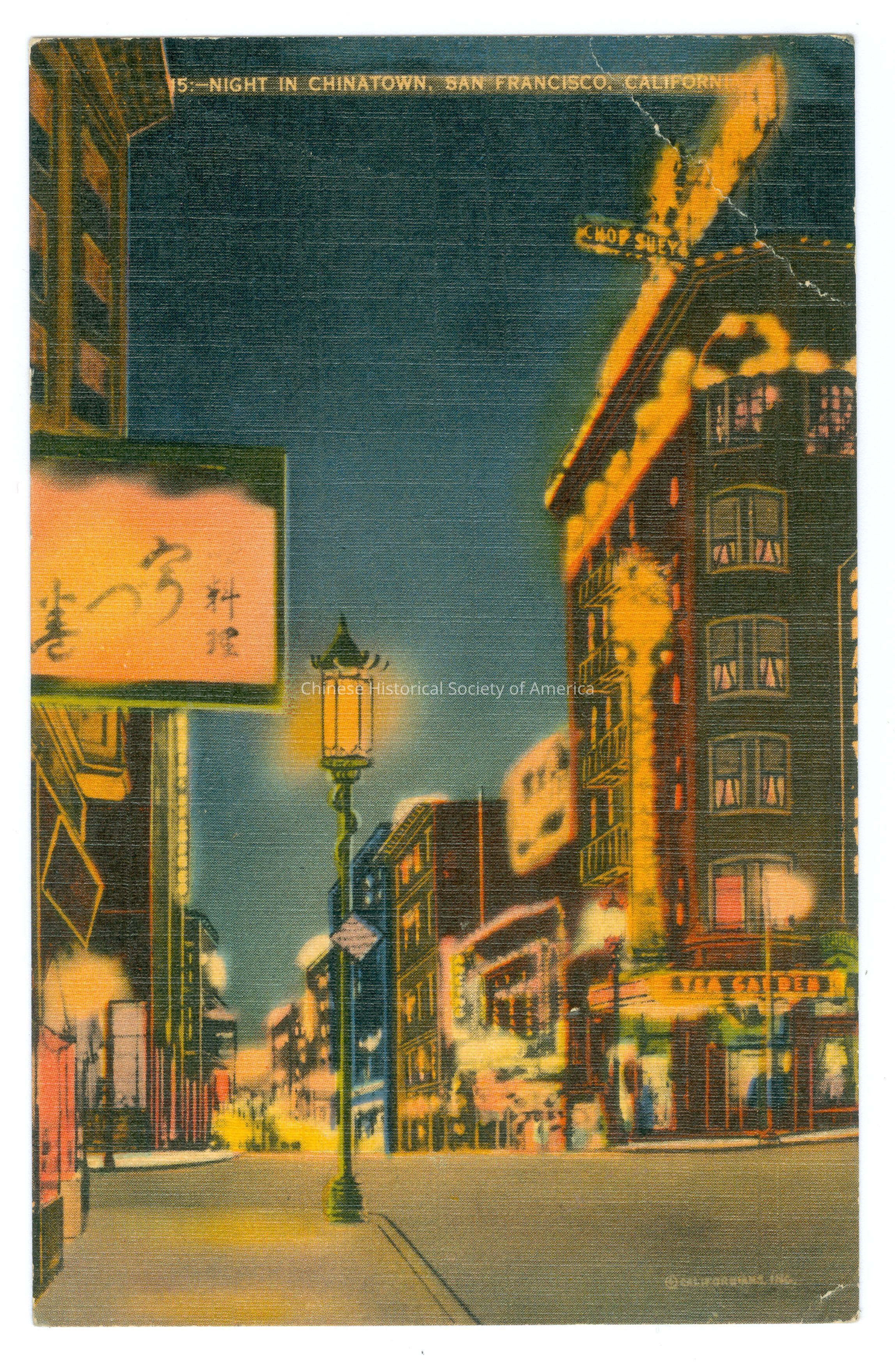 CHSA-04326 A-B. Color. Photo. SF; Chinatown; Street Scenes: A: A night scene of the streets where the buildings are lit with lights, one building has the sign "Chop Suey" at the roof and "Tea Garden" on street level and a street lamp on the sidewalk.
