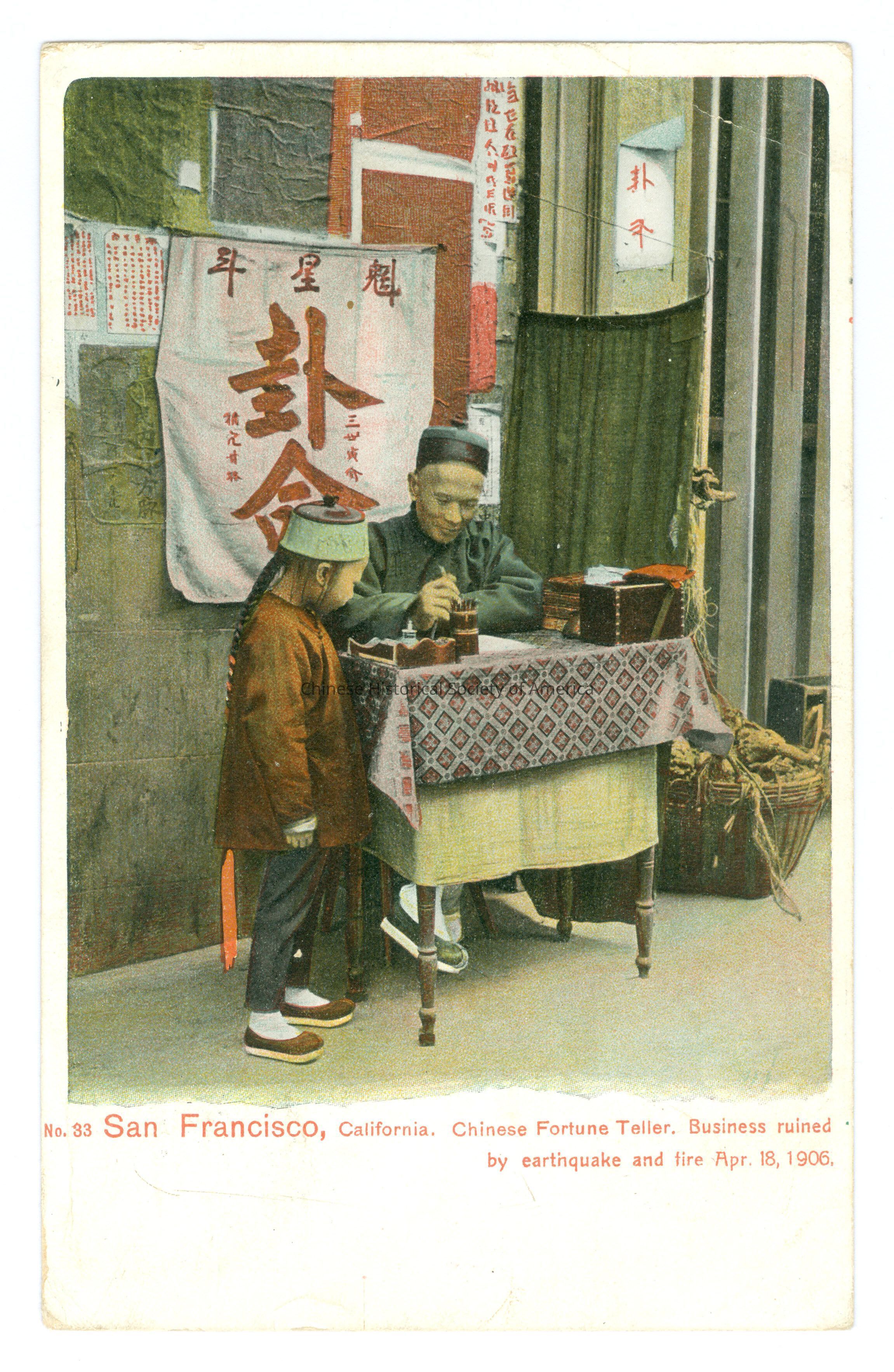 A-B: Front: Caption: "No. 33 San Francisco, California. Chinese Fortune Teller. Business ruined by earthquake and fire Apr. 18, 1906." A: Back: Postmark: "San Francisco, Cal. Jul 6 7-PM", stamped in black. Stamp: A green one cent stamp with a picture of Benjamin Franklin. Addressee: "Master Marsh Davis 700 Hancock St. Portland Oregon." Message: "Dearest Marsh;- I wish you were here with me to see the funny eights in Chinatown-we'd have this fellow tell our fortune wouldn't we Honey? Ray and in fact all of us enjoyed your box of candy so much and want to thank you for your kindness. With love to you and sister, I am always. Your loving Auntie and Jeff."