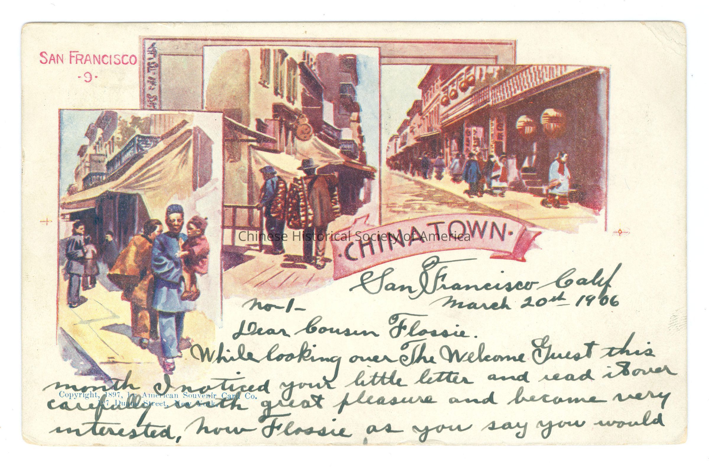 A: Front: Caption: "San Francisco -9-, Chinatown." Message: "San Francisco Calif March 20th 1906, No 1, Dear Flossie. While looking over The Welcome Guest this month I noticed your little letter and read it over carefully with great pleasure and became very interested, how Flossie, as you say you would."