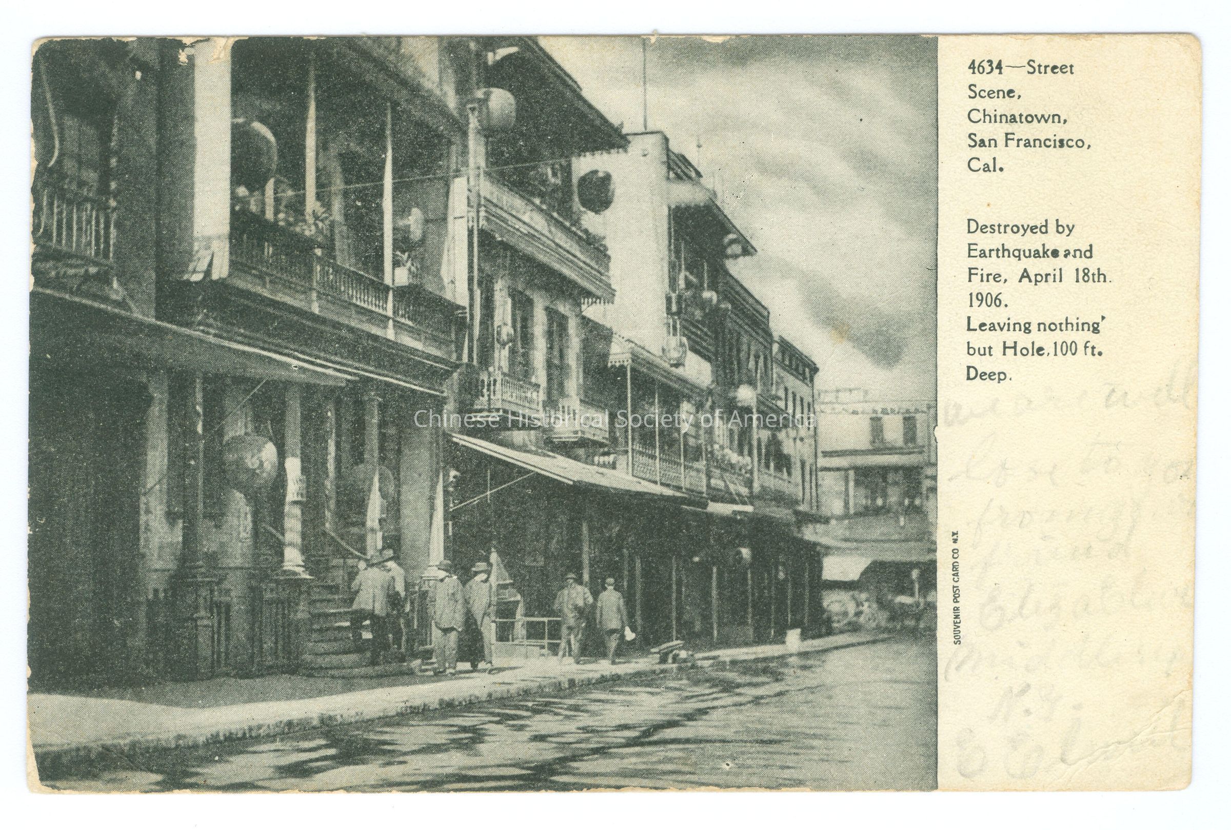 A: Front: Caption: "4634 - Street Scene, Chinatown, San Francisco, Cal. Destroyed by Earthquake and Fire, April 18th. 1906. Leaving nothing' but Hole.100 ft. Deep." Message: "we are well love to you from friend Elizabeth [---------]N.Y. E [-------]" Back: Postmark: Battle Creek Mich, Jun 2 1907 5 PM Addressee: Mrs. MG Reade 465 West Main Street Battle Creek Mich. Stamp: A green one cent stamp with a side picture of Benjamin Franklin, "U.S. Postage, One Cent"