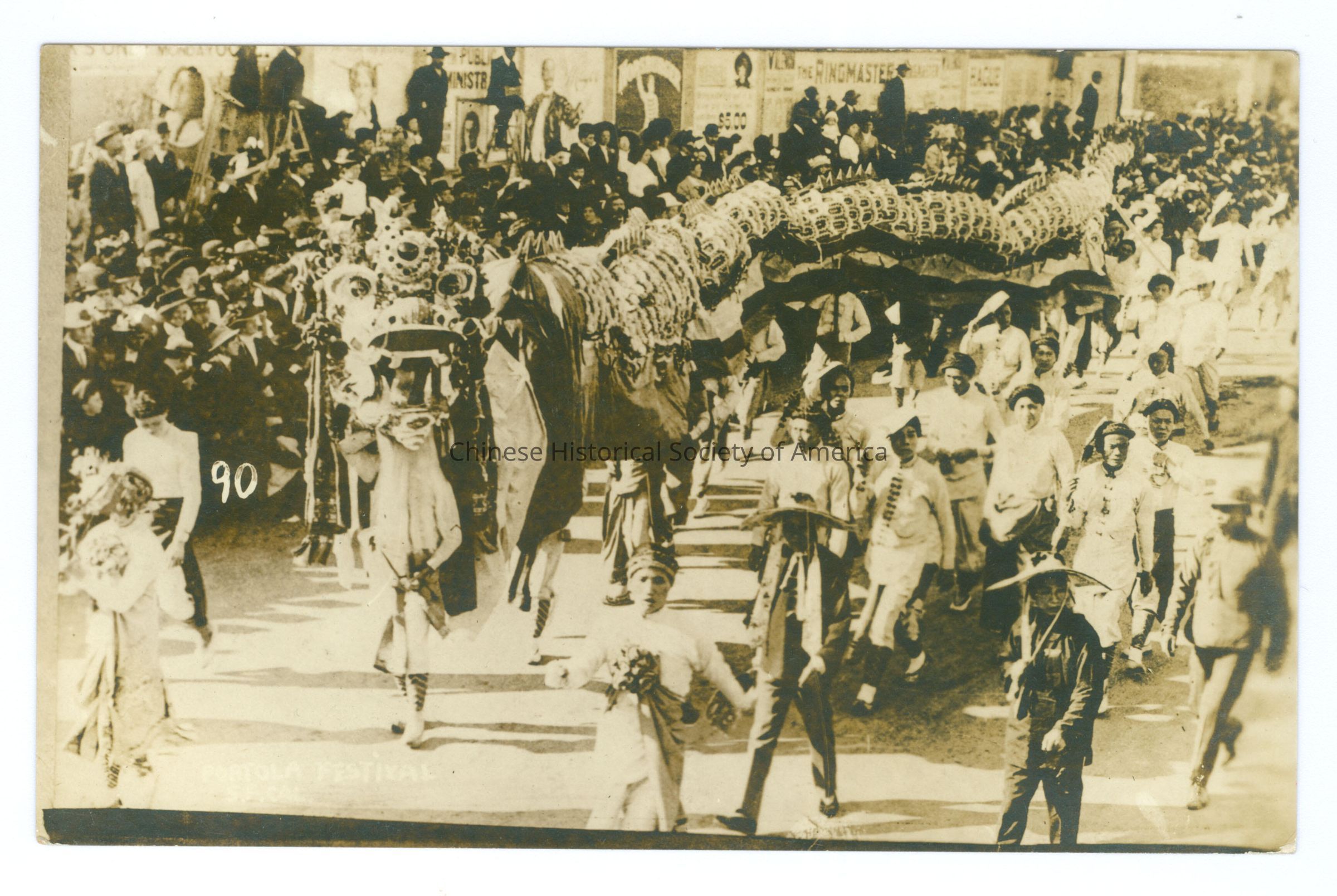 See CHSA-04436-04438. A-B: Front: Caption: "Portola Festival, S.F. Cal." "90." A: Back: "S.F. Portola Festival 1909", handwritten in pencil. Old Accession #: TCXX. B: Back: Old Accession #: KEF. C: Front: Caption: "Portola Festival, S.F.