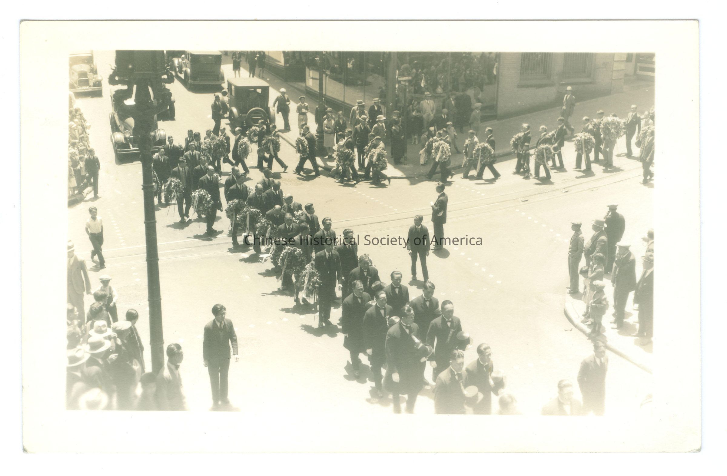 CHSA-04471 A-B. B&W. Photo. SF; Sun Yat Sen Funeral Procession: A-B: A procession of 2 rows of men in suits are carrying a wreath of flowers with people on the sidewalks watching.