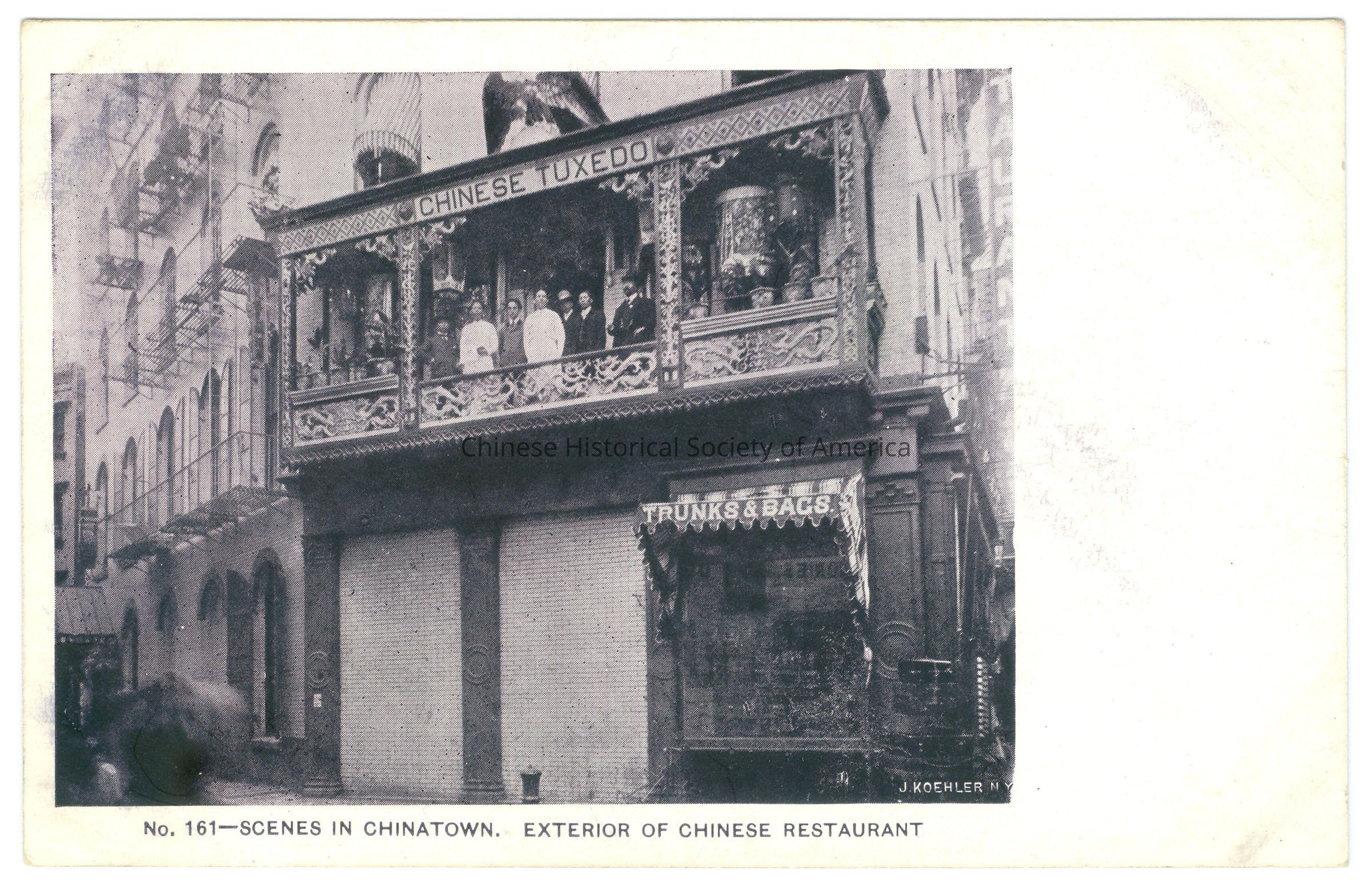 See CHSA-04732-33, CHSA-04782-04788. Front: Caption: "No. 161-Scenes in Chinatown. Exterior of Chinese Restaurant." Back: Old Accession #: DAE