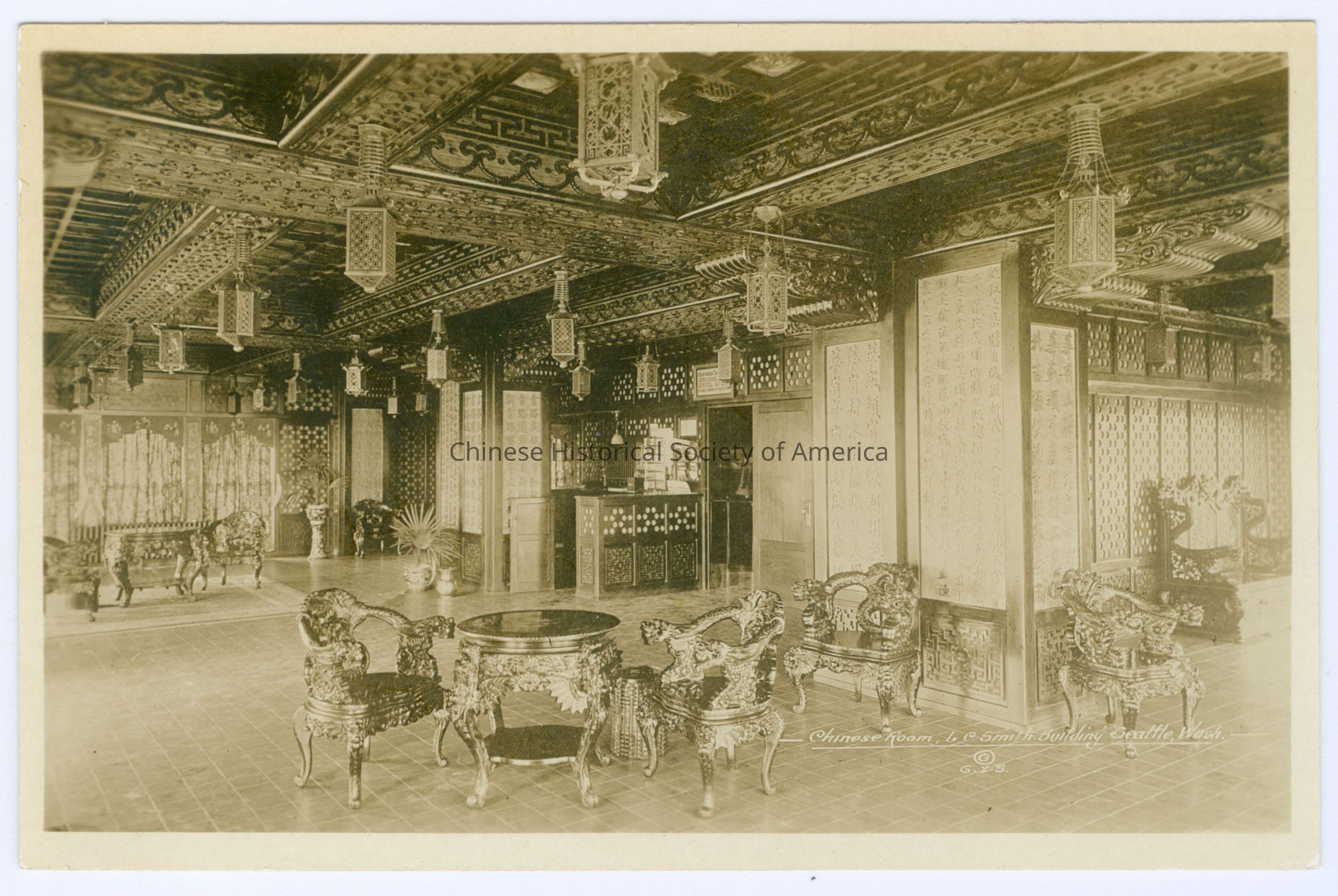 Front: Caption: "Chinese Room, LC Smith Building, Seattle, Wash,-" Back: "Mailed On Top 42 Story L.C. Smith Building Seattle, 500 ft. Above Sidewalk", stamped in blue. Old Accession #: D)-