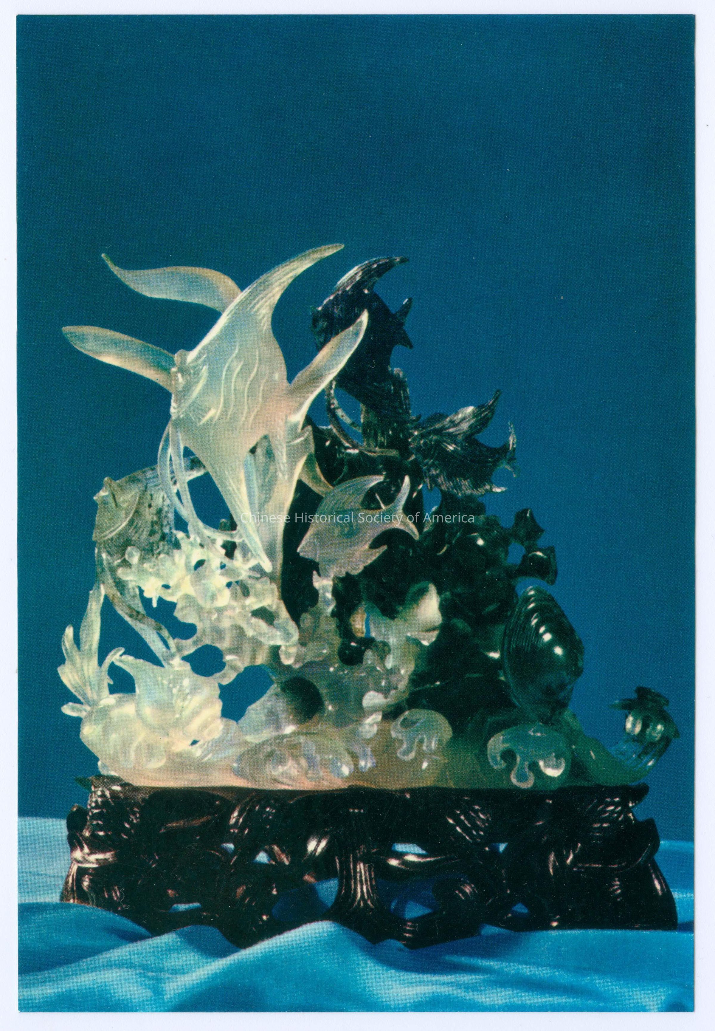 CHSA-08219 A-P. Color. Photo. China; Shanghai; Art; Jade Carvings: A: Postcard envelope. B: Text on the jade carvings. C-P: Color photos of various jade carvings.Dimensions