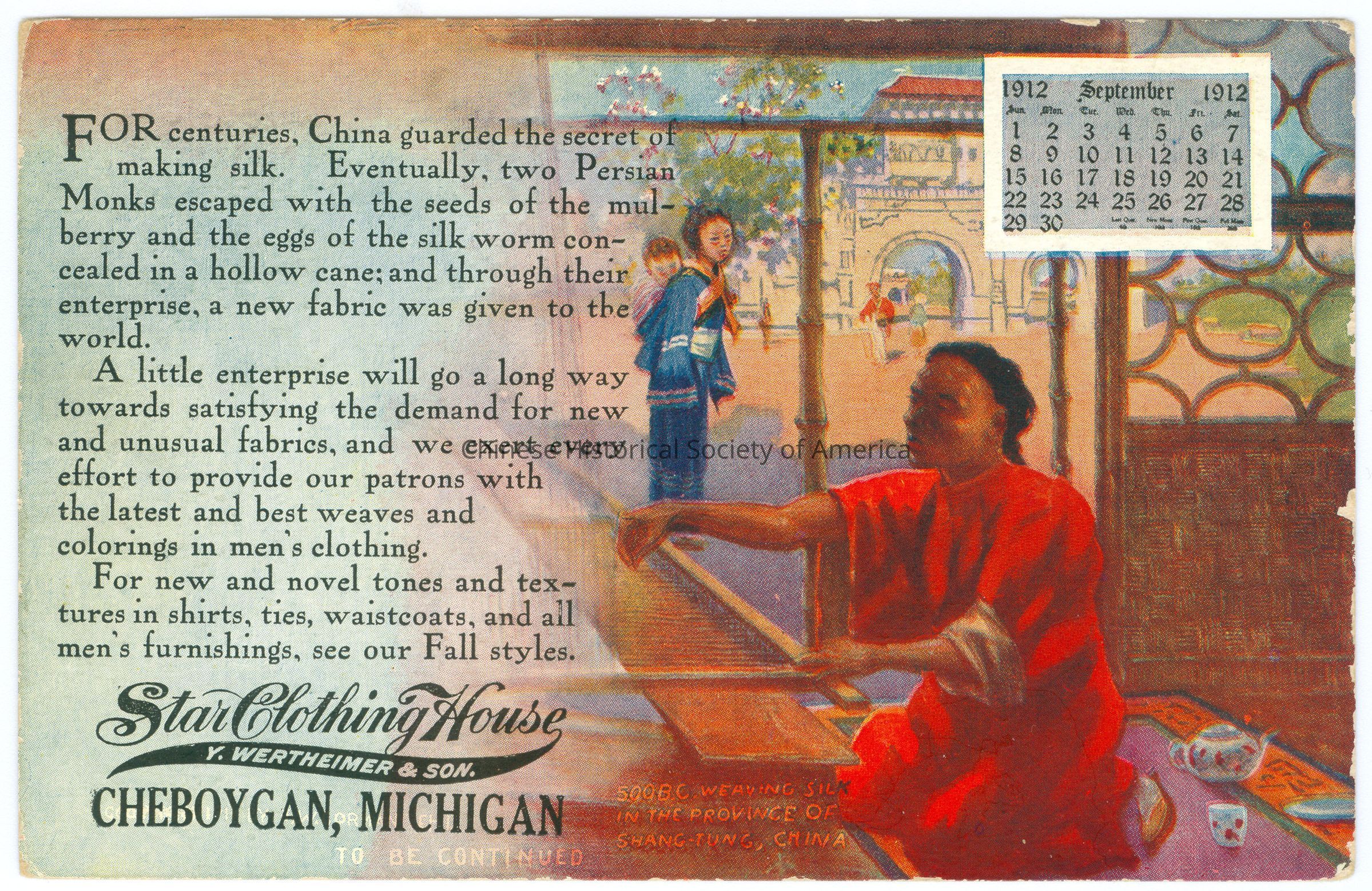 Front: Caption: "For Centuries, China guarded the secret of making silk. Eventually, two Persian Monks escaped with the seeds of the mulberry and the eggs of the silk worm concealed in a hollow cane; and through their enterprise, a new fabric was given to the world. A little enterprise will go a long way towards satisfying the demand for new and unusual fabrics, and we exert everty effor to provide our patrons with the latest and best weaves and colorings in men's clothing. For new and novel tones and textures in shirts, ties, waistcoats, and all men's furnishings, see our Fall styles. Star Clothing House, Y. Wertheimer & Son. Cheboygan, Michigan"; "To be continued"; "500 B.C. weaving silk in the province of Shang-Tung, China." Back: Postmark: "Cheboygan, Mich, 4 PM, Sep 2 1912", Stamp: a one cent green stamp with a side picture of Benjamin Franklin, "U.S. Postage One Cent" Message: "Hm B. Seamark City." Old Accession #: DE)-