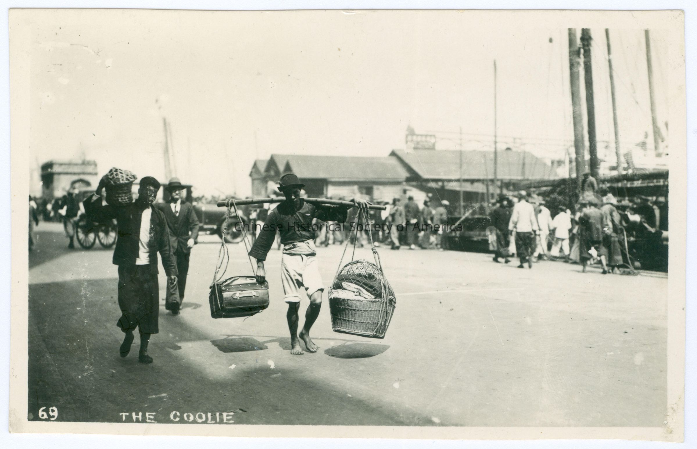 B&W. Photo. Local Industry; Coolies; Movers: By the docks, 2 Chinese men, one is holding a basket on his shoulder the other is balancing a small trunk and a basket of clothes on a pole on his shoulder, they are followed by a White man.
