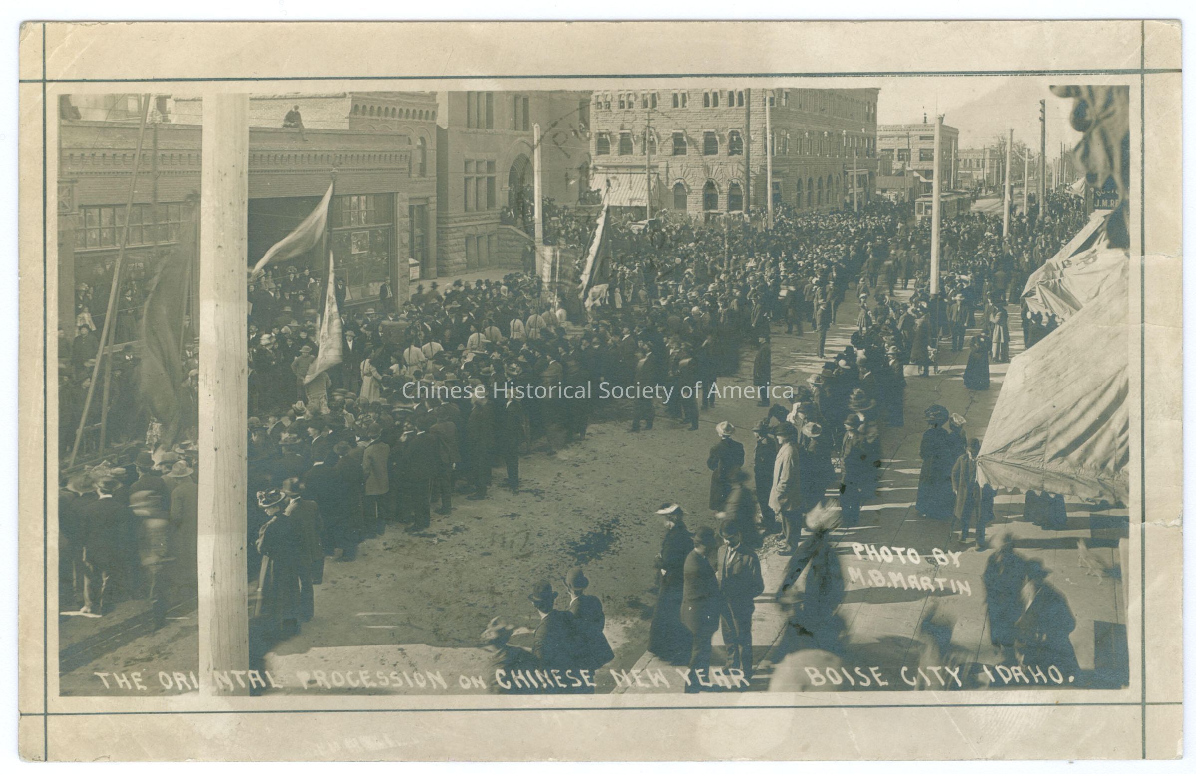 Front: Caption: "The Oriental Procession On Chinese New Year - Boise City Idaho." "Photo By M.B. Martin." Back: Postmark: "Bosie, Idaho, Feb 11 1909 8-PM", stamped in black. Stamp: A green one cent stamp with a picture of Benjamin Franklin, "Serie 1902, United States of America, 1706 Franklin 1790, Postage one cent". Message: "Suppose you are __ to Denver by now. Will write tomorrow __ the windows __ - Billy"; "Miss Bess Naoh, Pueblo, Colo, 102 __" Old Accession #: E)-