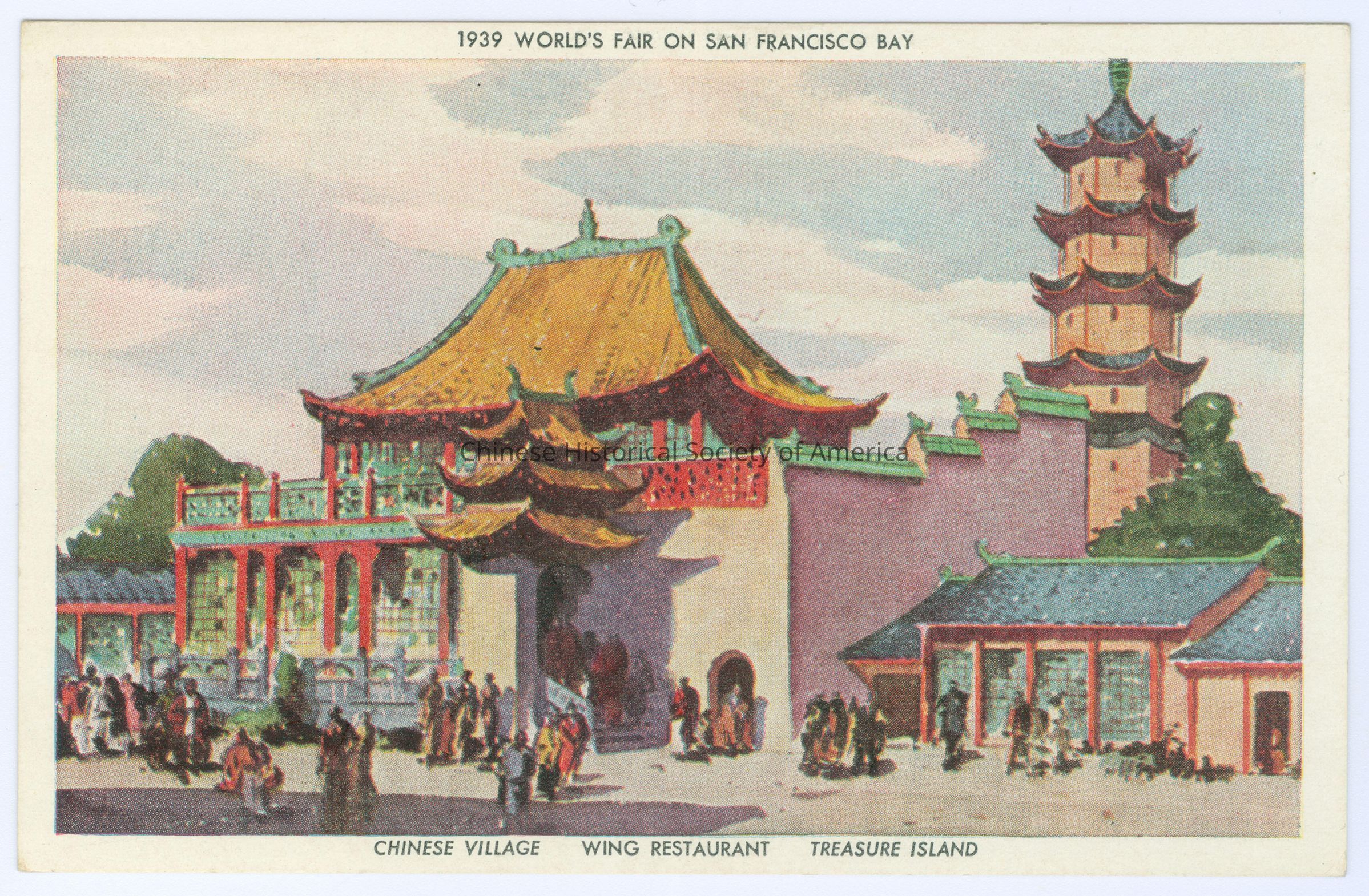 Color. Illus. California; Treasure Island; 1939 Golden Gate International Exposition; Wing's Restaurant: A picture outside is a tall pagoda behind a 2 story building with a pagoda roof with a green and red trim, there are people milling in front.