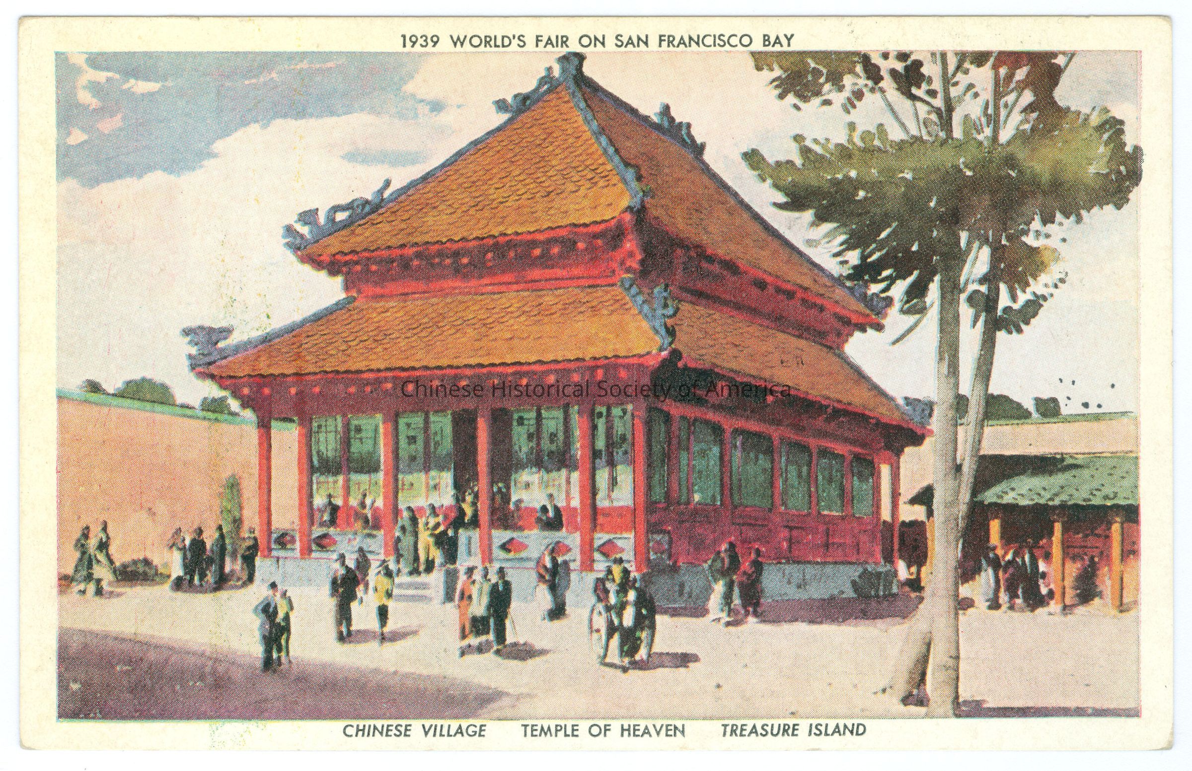 Front: Caption: "1939 World's Fair on San Francisco Bay; Chinese Village, Templed of Heaven, Treasure Island." Back: Info. Text: "Chinese Village Souvenir Post Card, 1939 Golden Gate International Exposition"; "Temple of Heaven on Treasure Island. Within this sacred shrine are gathered images of many of the ancient Chinese gods. Kneeling before altars, monks and native worshipers burn offerings of incense and good luck papers to seek fulfillment of their prayers."; "'When you come to the G.H.I.E. Don't miss The Chinese Village- and look for Jade Exhibit in the Pagoda. It's Marvelous!'"; "Copyright 1939- Chinese Factors, Incorporated- Printed in U.S.A." Old Accession #: N/A