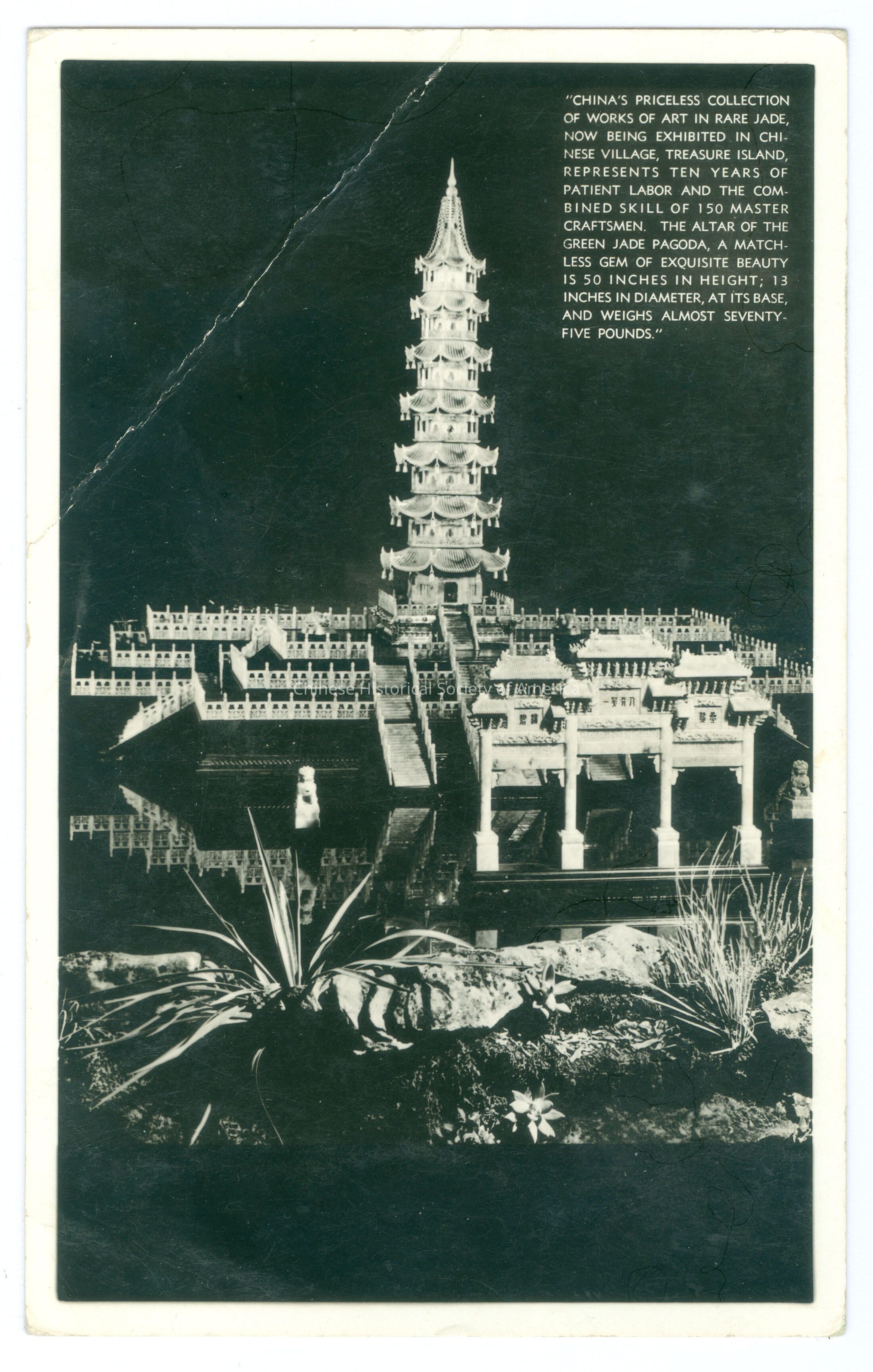 Front: Caption: "China's Priceless Collection of works of art in rare jade, now being exhibited in Chinese Village, Treasure Island, represents ten years of patient labor and the combined skill of 150 master craftsmen. The altar of the Green Jade Pagoda, a matchless gem of exquisite beauty is 50 inches in height; 13 inches in diameter, at its base, and weighs almost seventy-five pounds" Back: Old Accession #: N/A