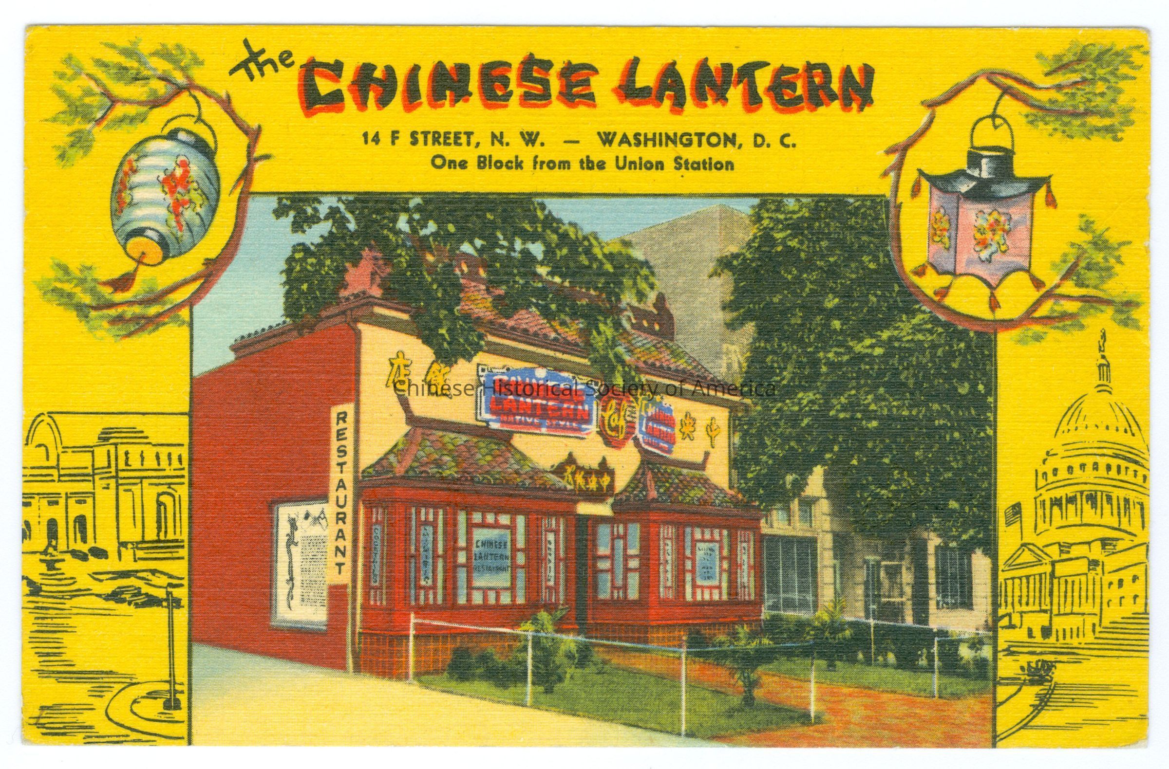 Front: Caption: "The Chinese Lantern, 14 F Street, N.W. - Washington, D.C. One Block from the Union Station." Back: Info. Text: "The Chinese Lantern, 14 F St., N.W. Washington, D.C. Telephones: Lincoln 6524 - Trinidad 9534, This Air Conditioned Restaurant server thr most delicious food of typical Chinese Native Style. American Food and your favorite Drinks served daily. Special Dining Rooms for Banquets and Parties. Fresh Products and Poultry Supplied from our own Farms."; "Genuine Curteich-Chicago "C.T. Art. Colortone" Post Card (Reg. U.S. Pat. Off)" Old Accession #: DEX