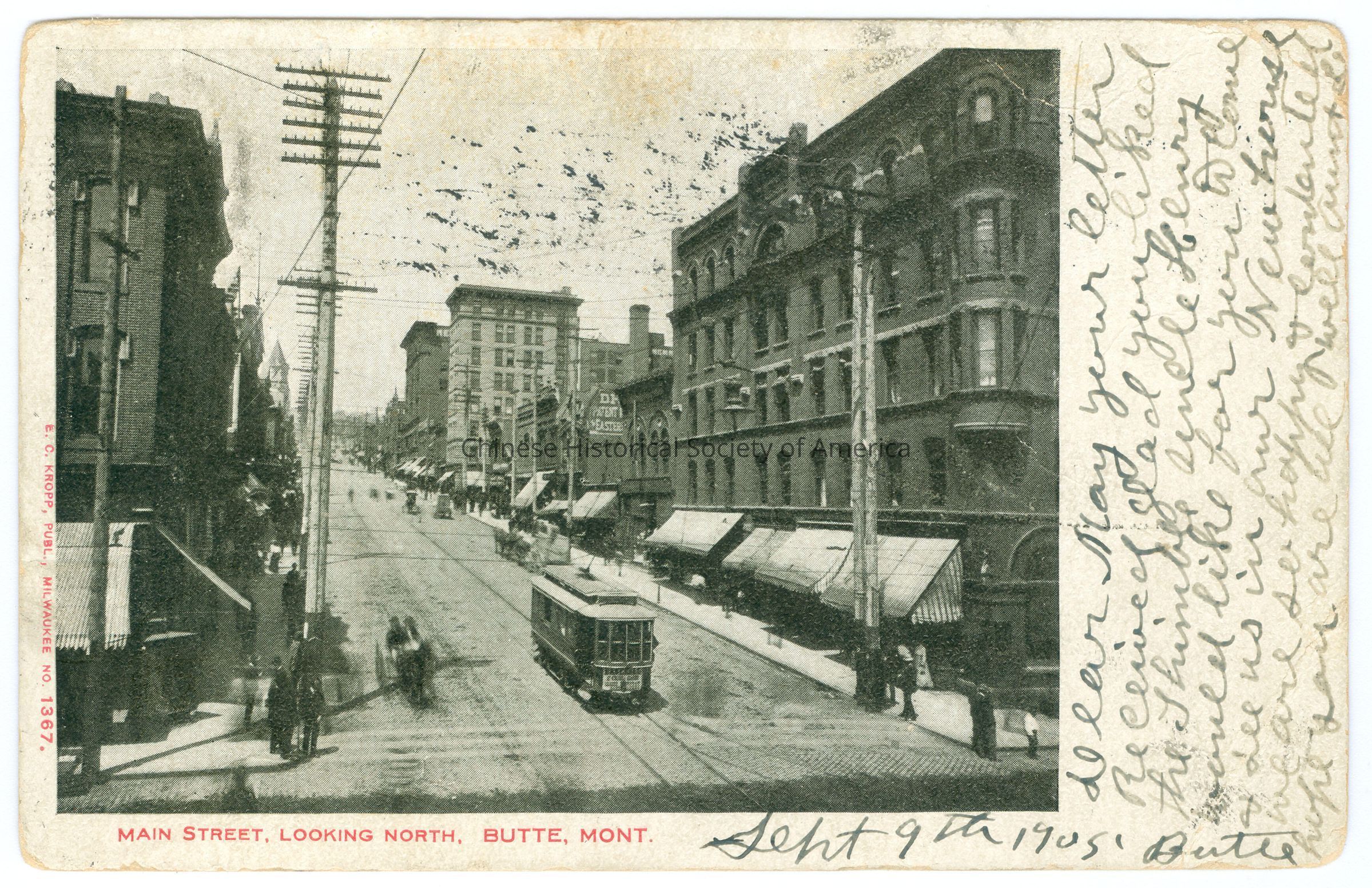 Front: Caption: "Main Street, Looking North, Butte, Mont." Message: "Sept 9th 1905, Butte, Dear May your letter received glad you liked the thimble and Henry would like for you to come + see us in our New house we are so happy +Contented hope you are all well. Aunt Le" handwritten in black. Back: Postmark: 4 postmarks, "Butte, Mont, Sep 11 1905, 5PM"; "Butte, Mont. Sep 10 1905, 4-PM"; "Pueblo,Colo. Sep 14 1905, 2 AM"; "Pueblo, Colo. Sep 14 1905, 630AM" stamped in black. Stamp: a one cent green stamp with a picture of Benjamin Franklin, "Serie 1902, United States of America, 1706 Franklin 1790, Postage one cent". Message: "No. 9 IV. Washington St, Butte Merit"; "Miss May Roberts, E Fifth, and Seminary in care of Samuel Roberts, Pueblo Colorado." handwritten in black. Old Accession #: GAE