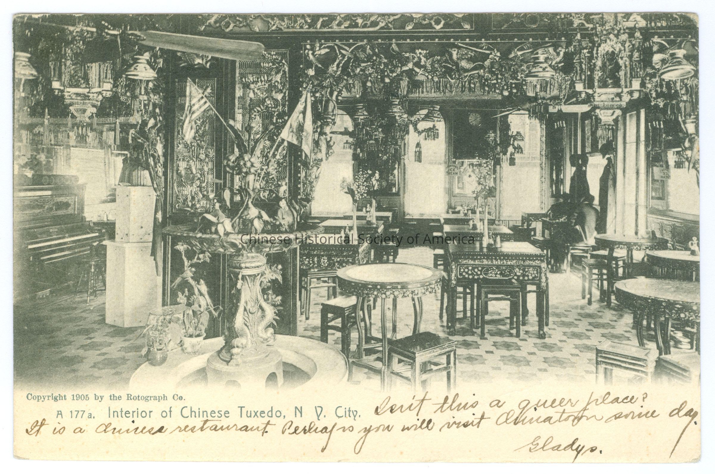 See CHSA-04732-33, CHSA-04782-04788. A: Front: Caption: "A 177a. Interior of Chinese Tuxedo, N.Y. City."; "Copyright 1905 by the Rotograph Co.". Message: "Isn't this a queer place? It is a Chinese restaurant. Perhaps you will visit Chinatown some day. Gladys.", handwritten in black. Back: Info. "The Rotograph Co. N.Y., City (Germany.)" Postmark: "Brooklyn, N.Y. Sta.B, Feb 3 1907, 5-PM" stamped in black. Stamp: a one cent green stamp with a picture of Benjamin Franklin, "Serie 1902, United States of America, 1706 Franklin 1790, Postage one cent". Message: "Maester Edward Cameron, 173 Western Ave. Albany N.Y." handwritten in black. Old Accession #: -LX