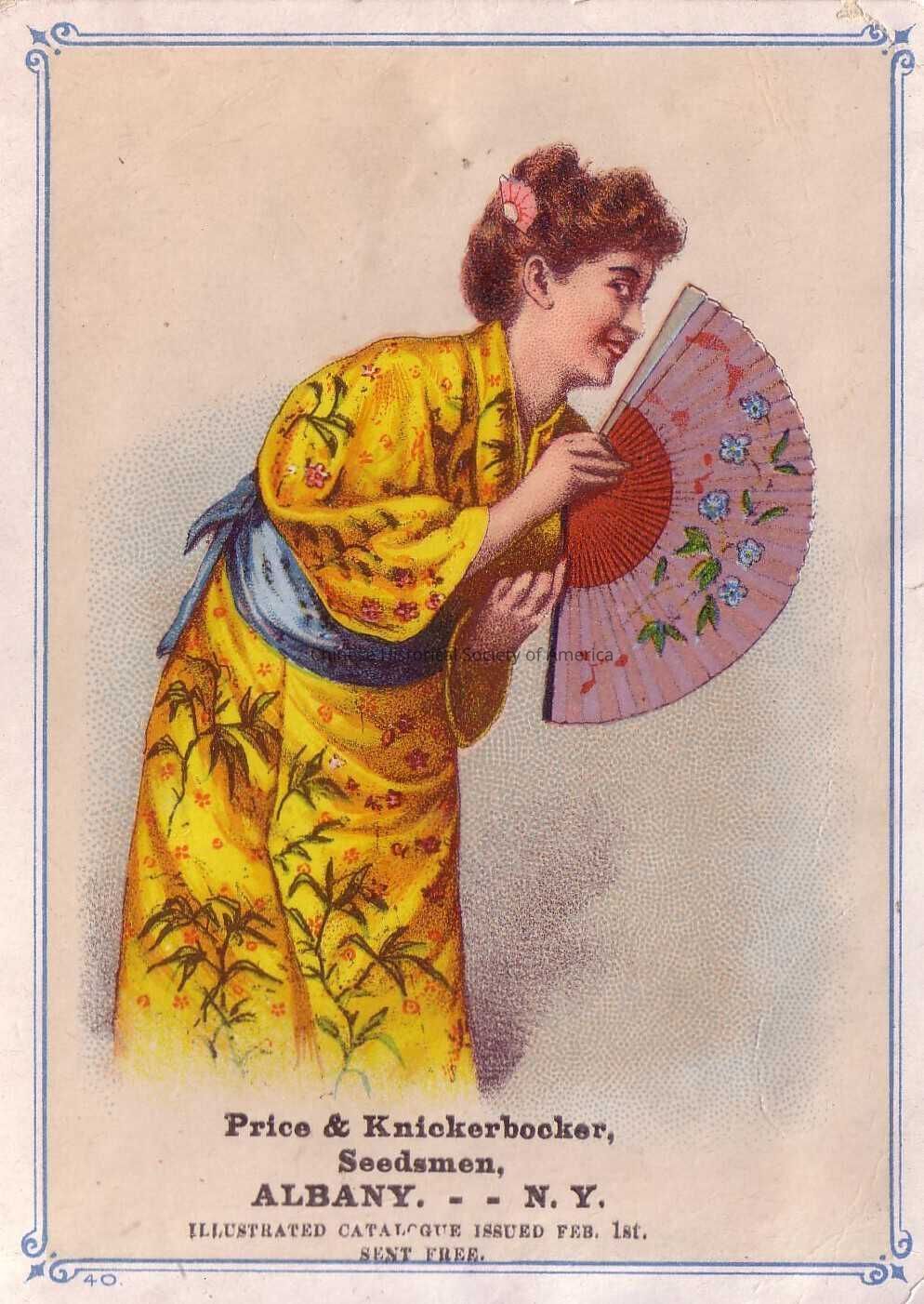 Front: A Caucasian woman wearing a yellow traditional robe with a bamboo design and a baby blue slash is slightly bent over and hiding behind her open purple fan. The following is the advertisement for the tradecard: