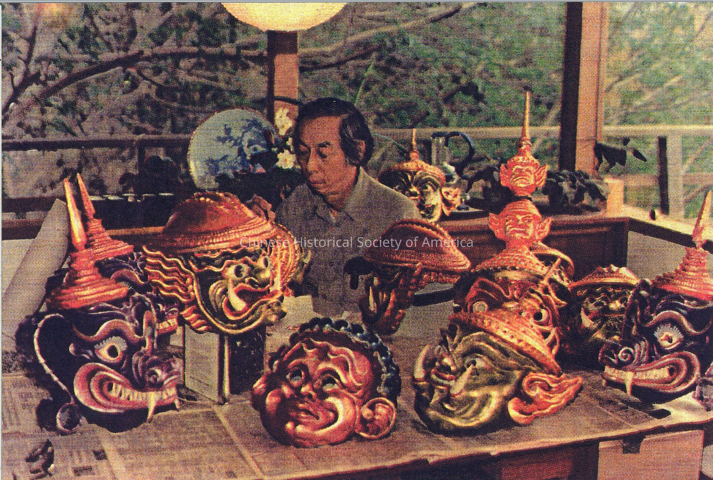 Wah Ming Chang with masks for the King and I ballet squence. Molded rubber with hand painted surface and applied decorations