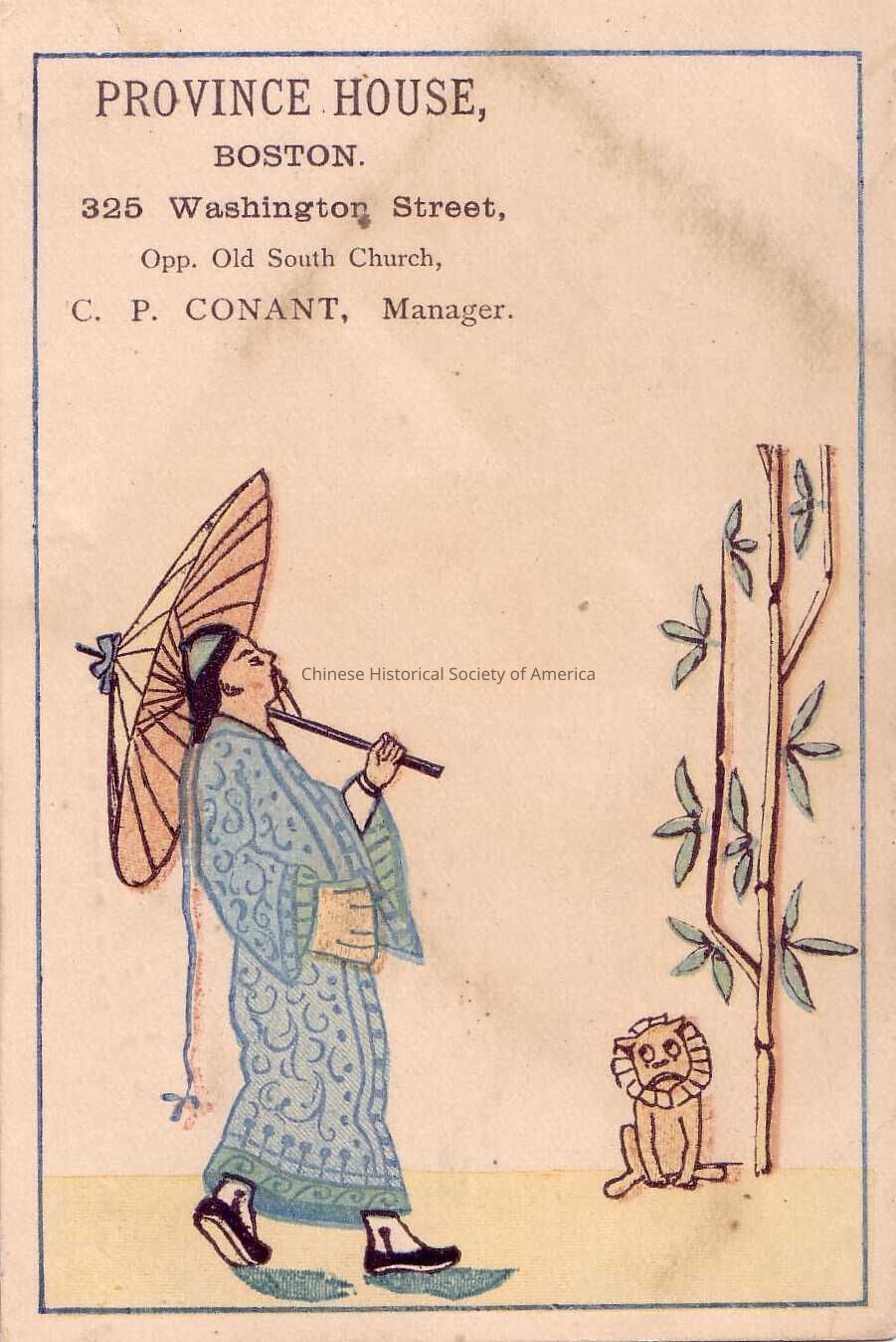 Front: A Chinese man with a long queue, and in a traditional blue robe is holding an umbrella while he walks. Glancing up at this man is a yellow lion sitting next to a bamboo plant. The following words are written on the enclosed upper left hand corner near the plain blue border: