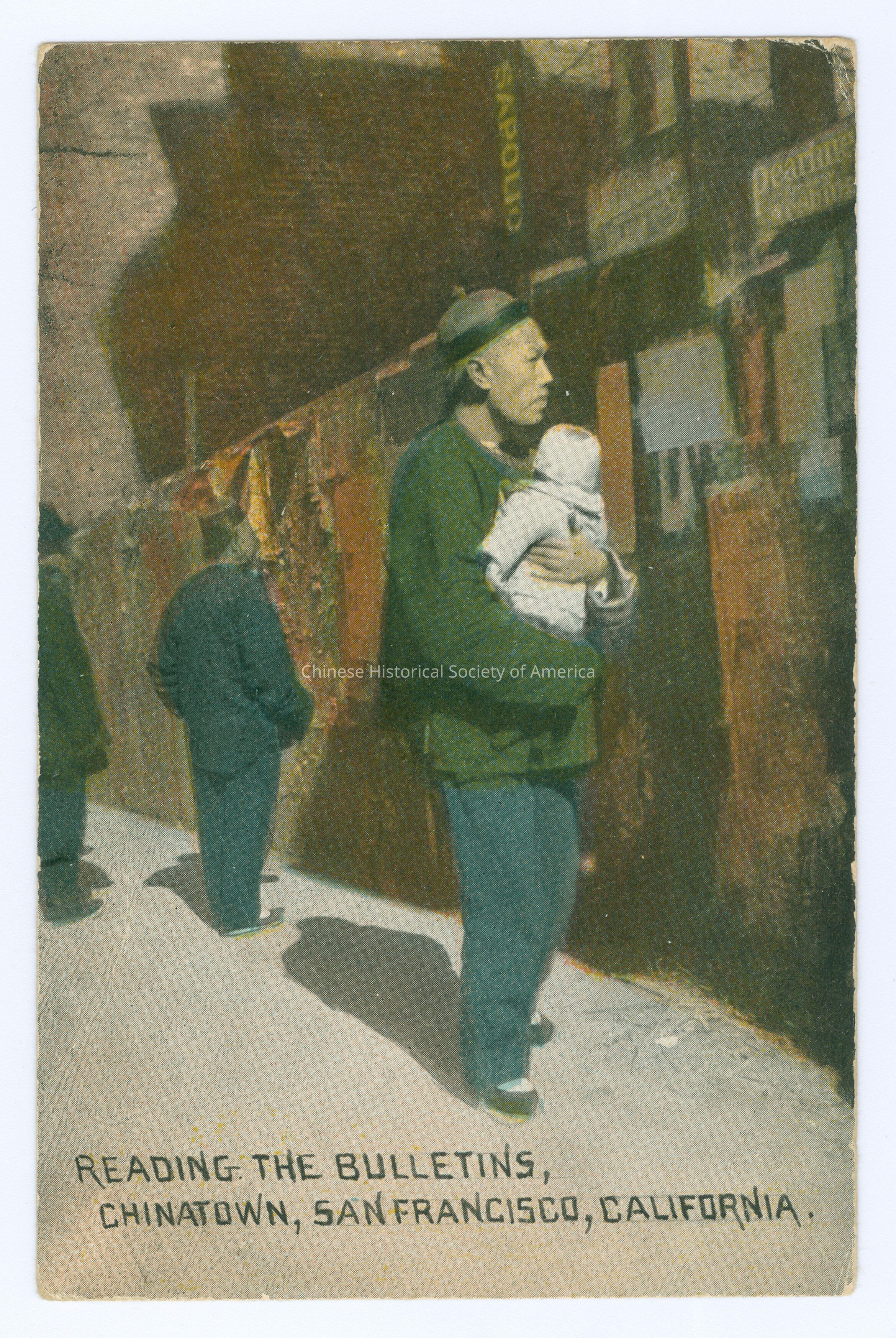 Front: Caption: "Reading the bulletins, Chinatown, San Francisco, California." Back: Info. Text: "'On The Road of a Thousand Wonders.' Publ. by the Pacific Novelty Co., San Francisco."