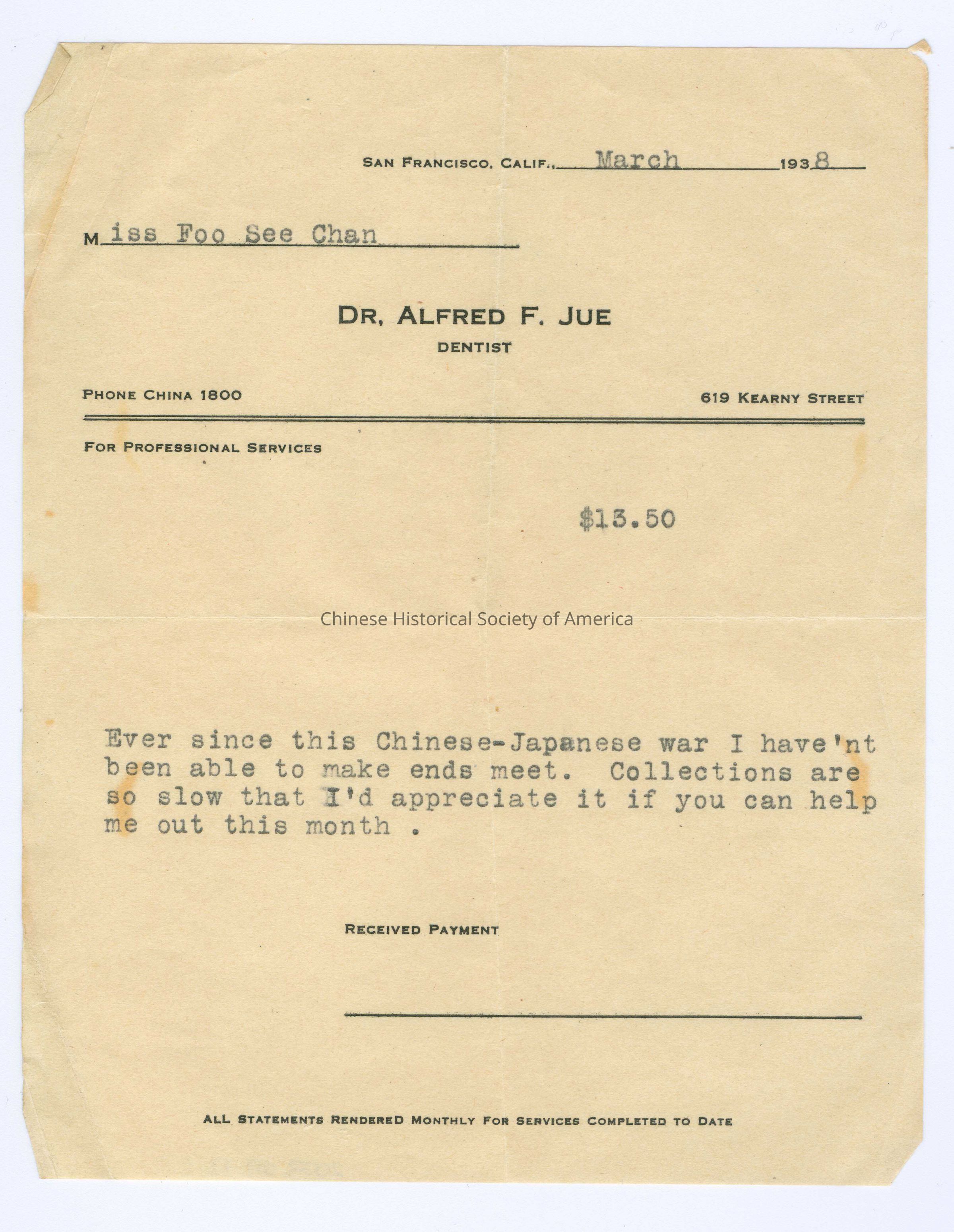 Receipt for Miss Foo See Chan from Dr. Alfred F. Jue for $13.50 service in March 1938.General Notes