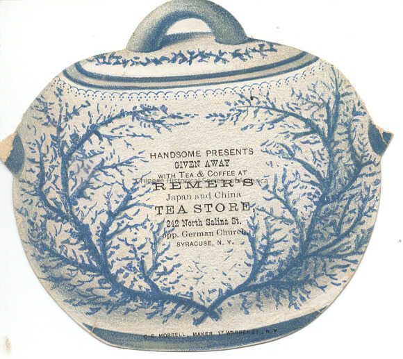 Front: In a tea pot cut-out illustrated in blue and white are tree vines and branches surrounding the pot. Advertised in the center is the following: Handsome Presents Given Away with Tea and Coffee at