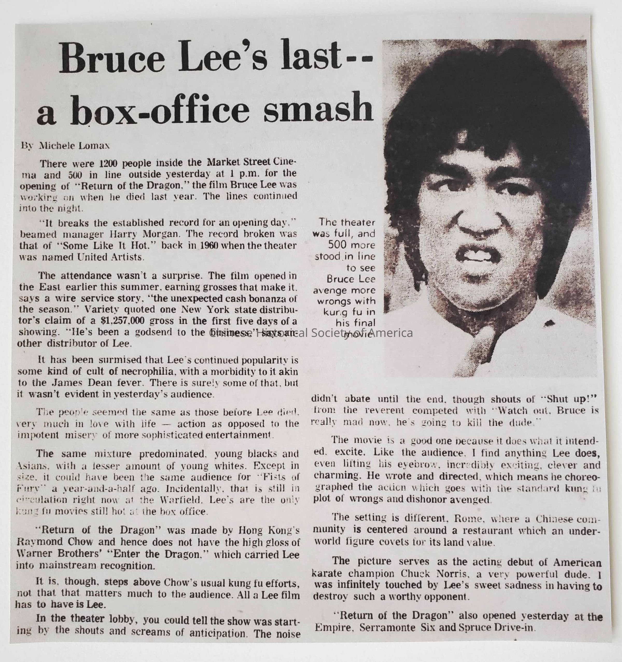 Return of the Dragon newspaper article, Bruce Lee's last--a box-office smash, 1974Context