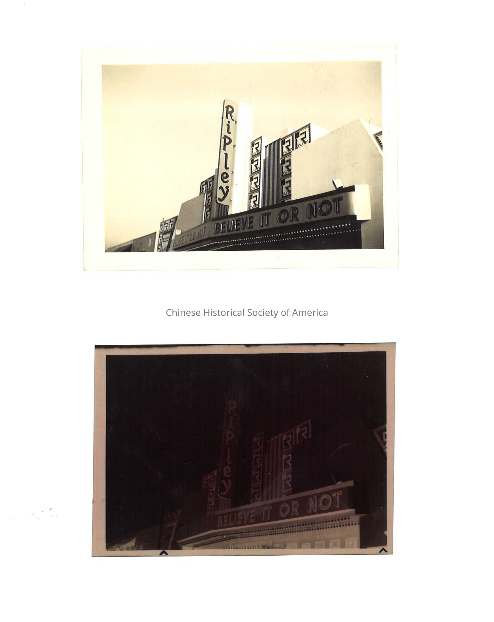 A: Ripley's Believe it or Not museum with a name sign on the building. B: photo negative