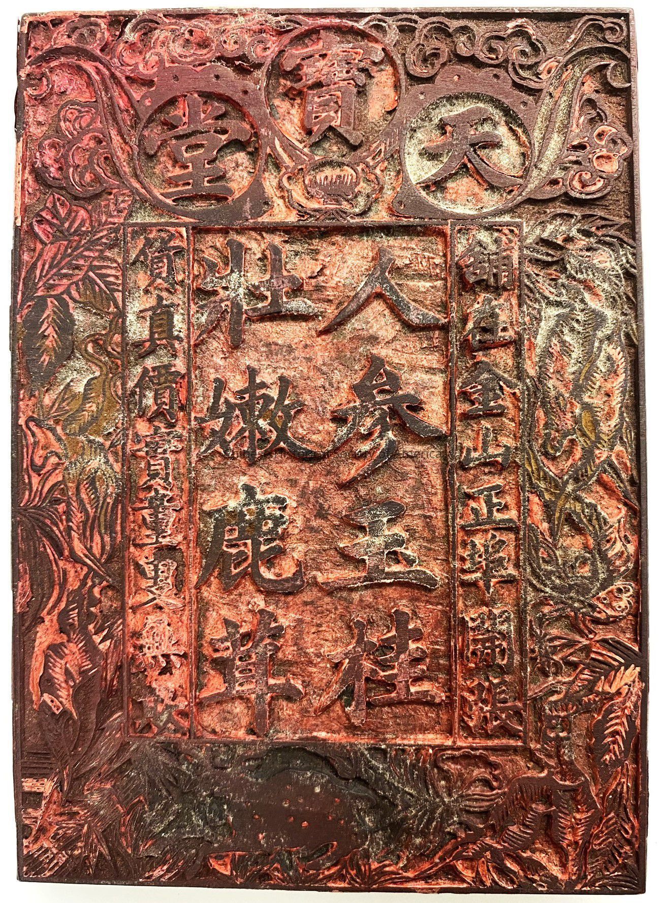 Rubber stamp dyed with red ink, on a wood block. The stamp reads, "Tianbao Hall: Grand Opening of Jinshan (San Francisco) Main Port, Genuine Goods at Fair Prices, No Deception to Young or Old. Ginseng, Cinnamon, and Tender Deer Antler."