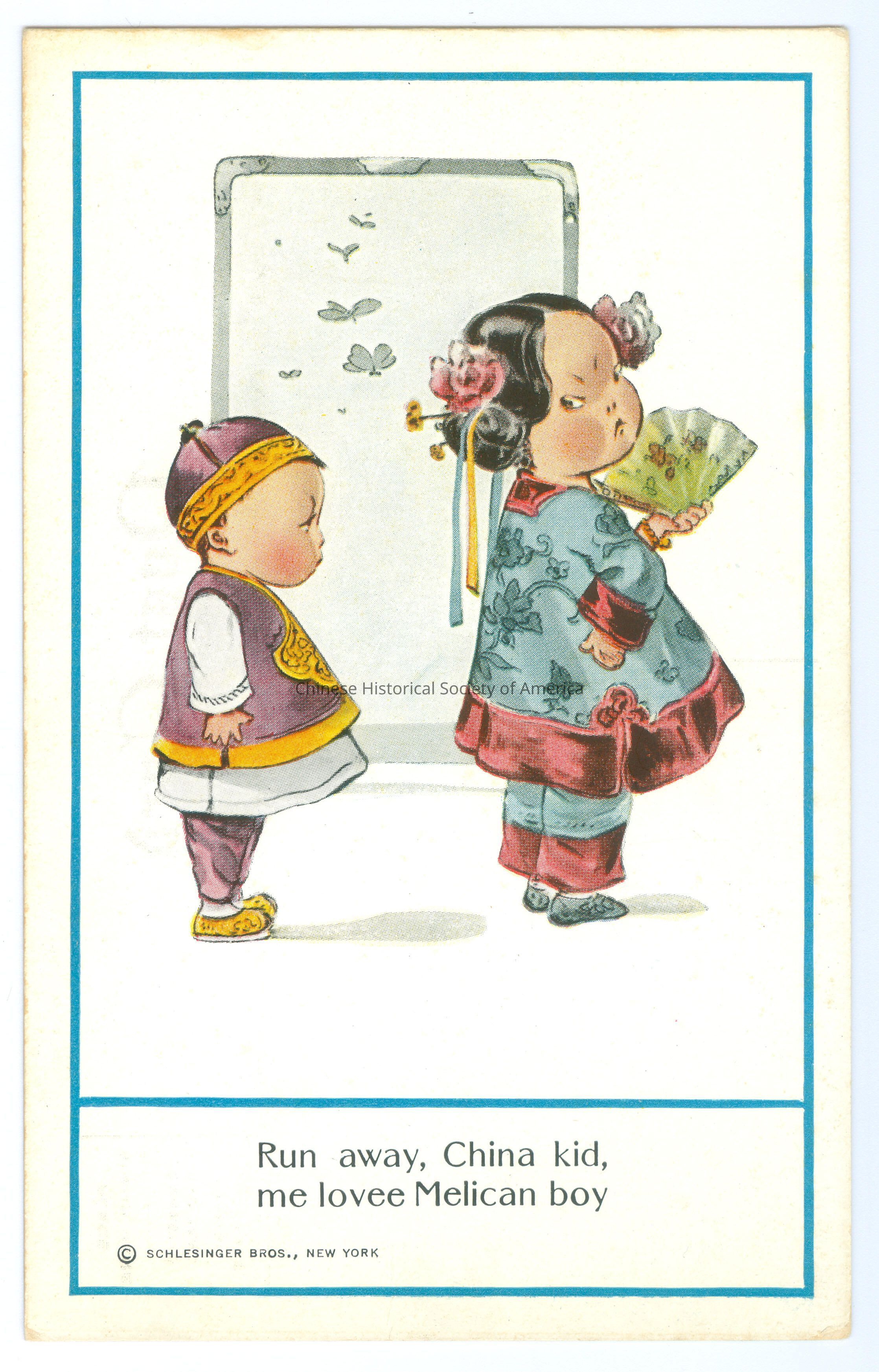 See CHSA-05004, 05005 B, 05006-05008. Front: Caption: "Run away, China kid, me lovee Melican boy." "Schlesinger Bros., New York." Back: "151-6"; "Published by Schlesinger Bros. New York." Old Accession #: AET