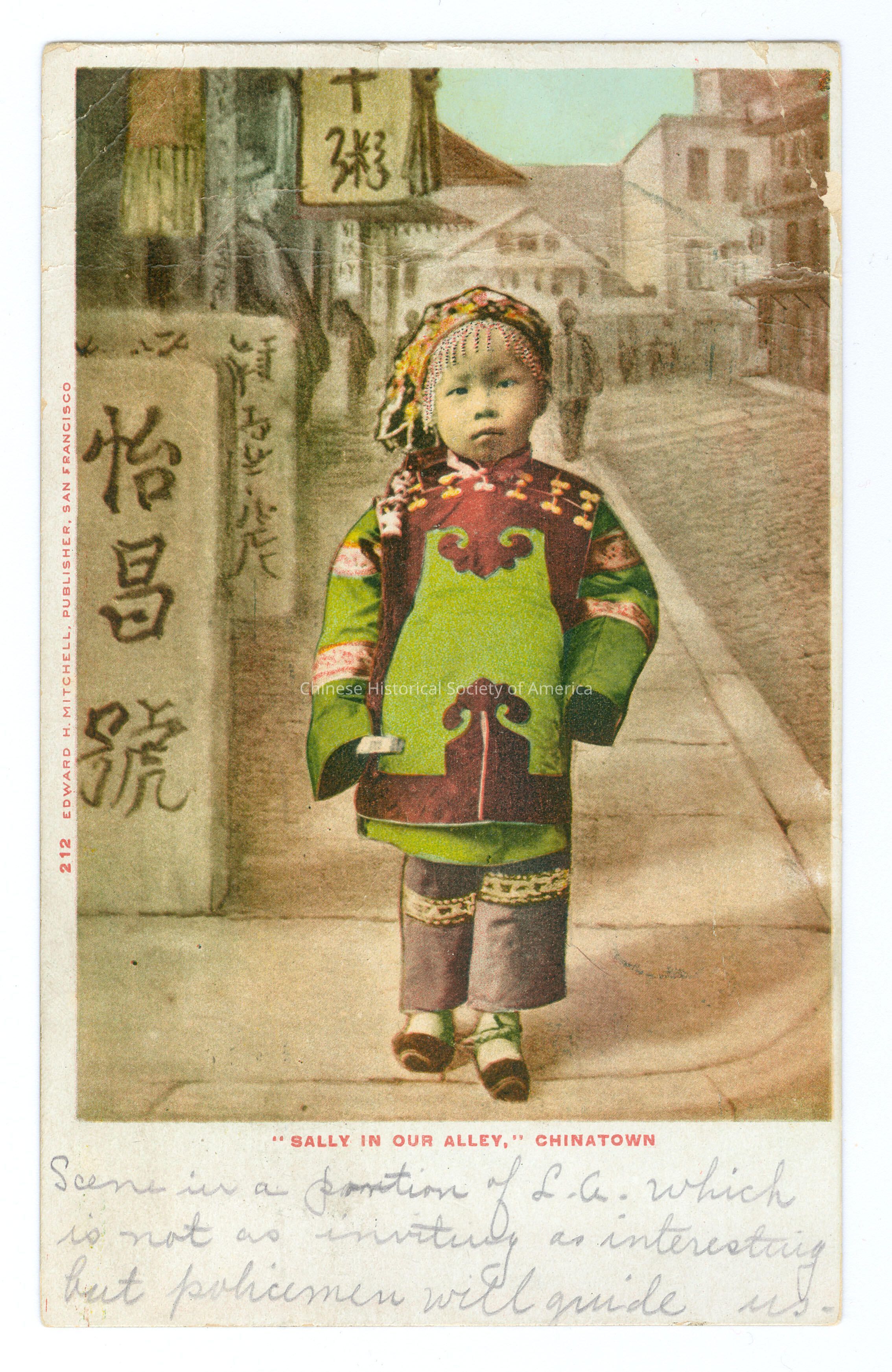 Front: Caption: ""Sally In Our Alley," Chinatown." Message: "Scene in a portion of L.A. which is not as inviting as interesting but policemen will guide us.", handwritten in pencil. "212 Edward H. Mitchell, Publisher, San Francisco." Back: PostmarkDimensions