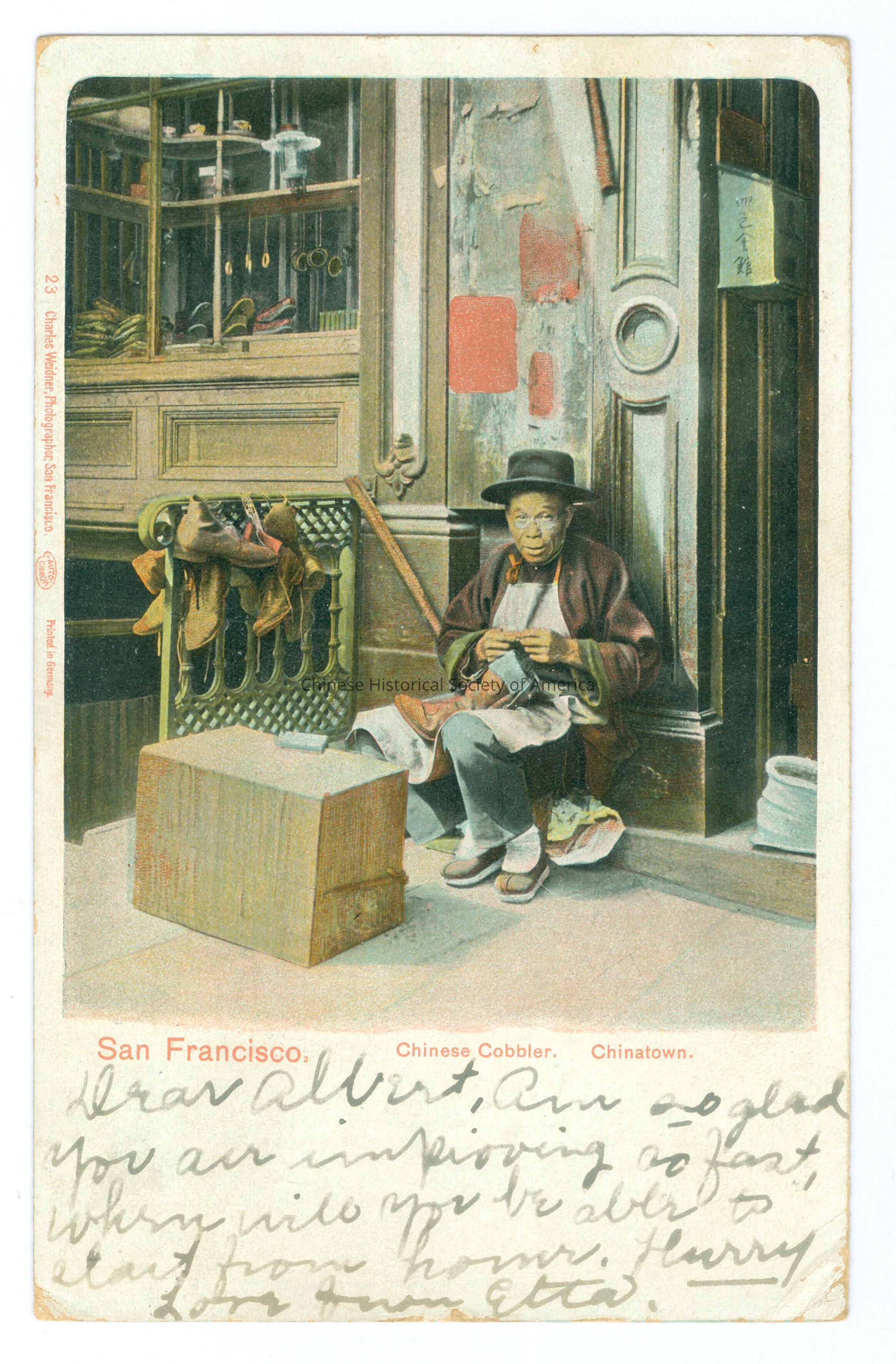Front: Caption: "San Francisco, Chinese Cobbler. Chinatown." "23 Charles Weidner, Photographer, San Francisco, Auto-Chrom, Printed in Germany." Message: "Dear Albert, Are so you are improving so fast, when will you be able to start from home. Hurry. Love from Etta." Back: "Albert B. Canary Bluehill Falls Maine." "United States of America Postage 1 Cent Postage."