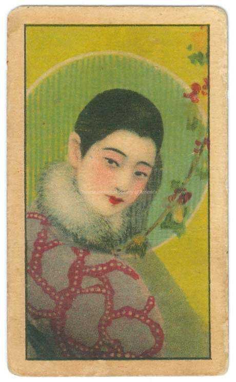 CHSA-07827 A. Color. Illus. China; San Shing Tobacco Co.: Up close view of a young Chinese maiden with a green background, the young girl has her hair pulled back with a fur trimmer collar.