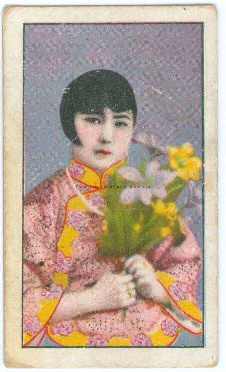 Color. Illus. China; San Shing Tobacco Co.: Purple background with an up close view of a young Chinese maiden wearing a yellow and pink cheong sam, she has a short sleek haircut and is holding purple and yellow flowers.
