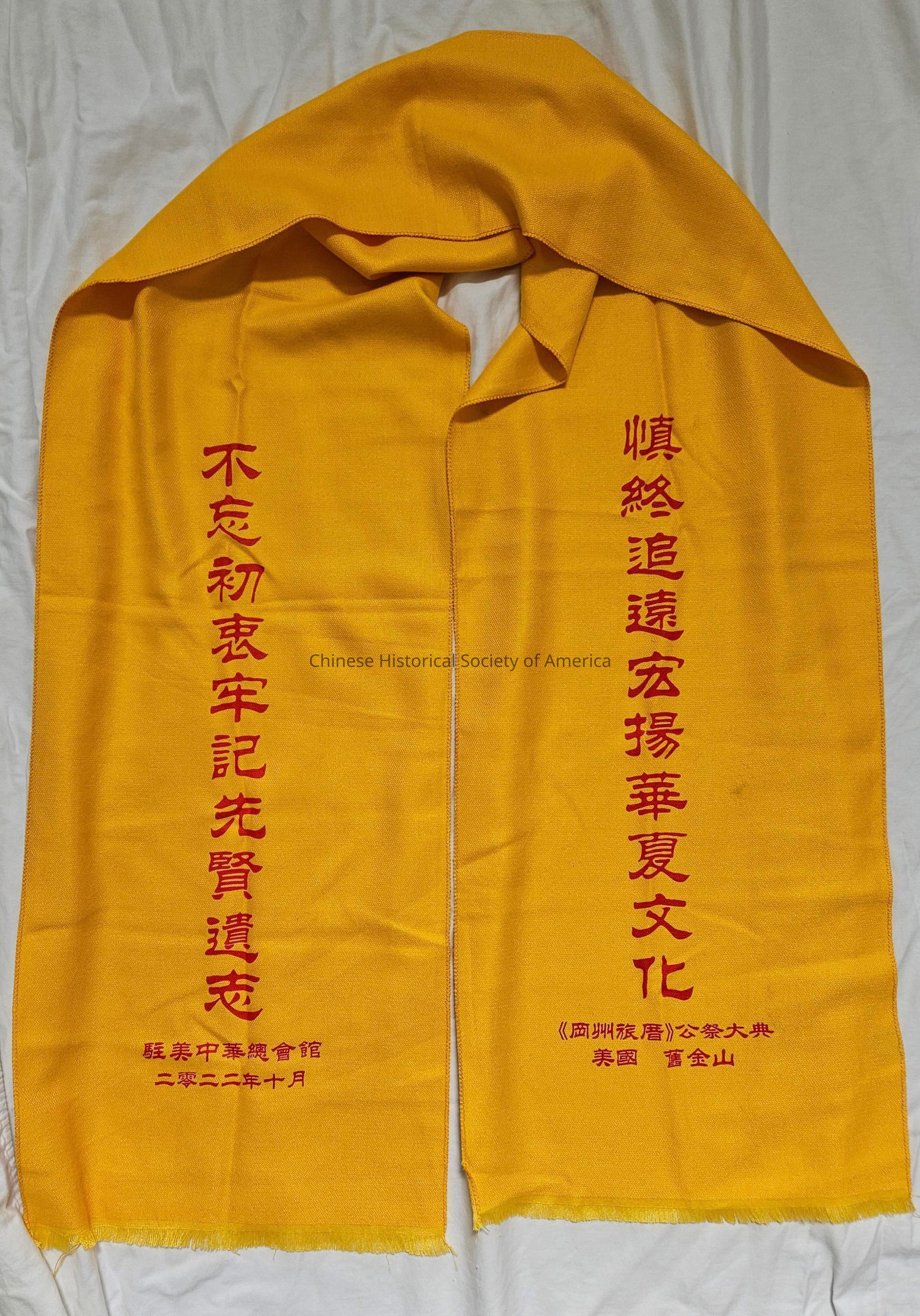Commemorative scarf given to CHSA employee during ceremony at the Kong Chow Temple gate in Lincoln Park, San Francisco CA.Context