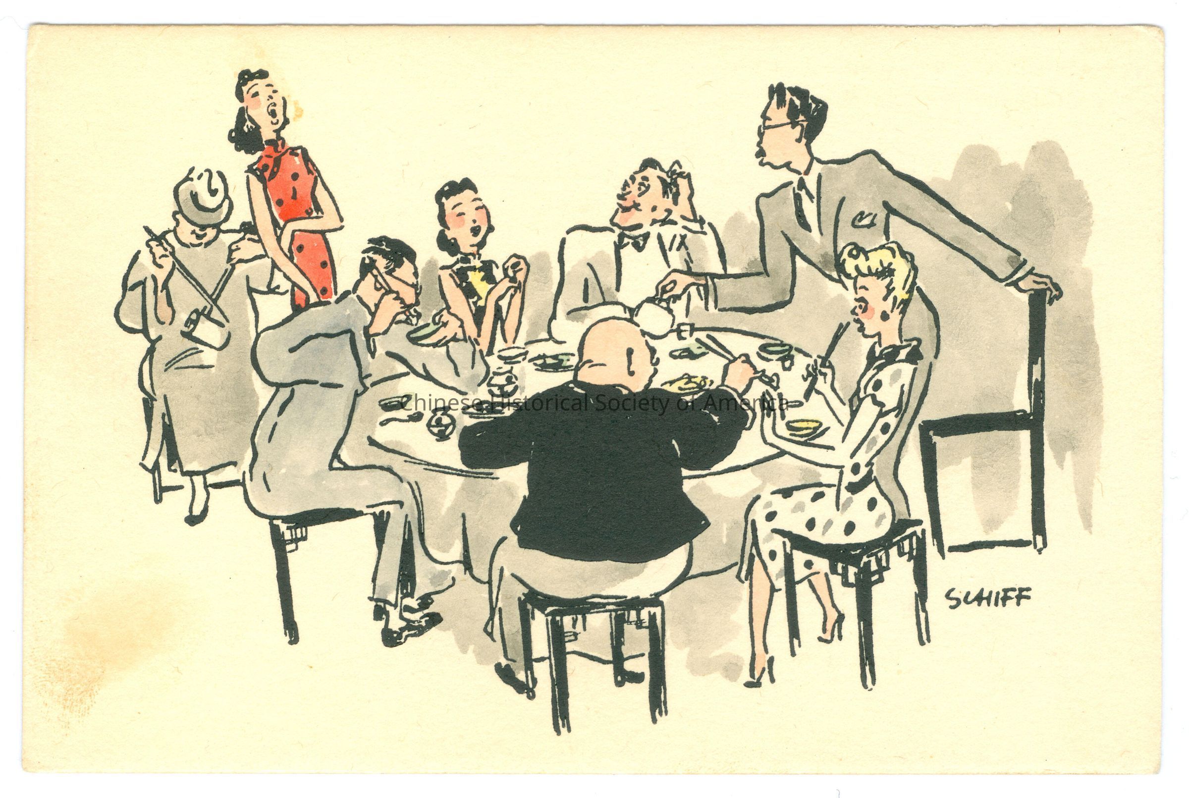 Color. Illus. Caricatures; Women; Eating: Chinese woman is sitting at a table eating with 2 Chinese men in suits and 3 White men and women, behind them is another Chinese woman singing and a man playing an instrument.