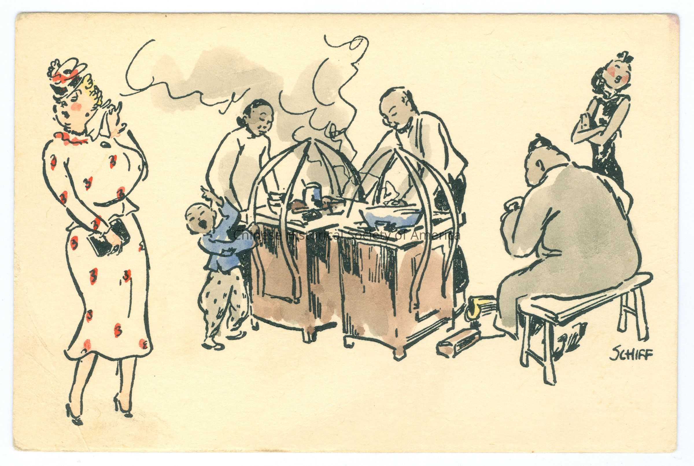 See CHSA-05025-05032. Front: "Schiff." Back: Info. Text: "Schiff's Sketches "Call of the East" Hand-Coloured Edition." "Copyright by Pacific Press Service, Shanghai, P.O. Box 824." Old Accession #: DNE