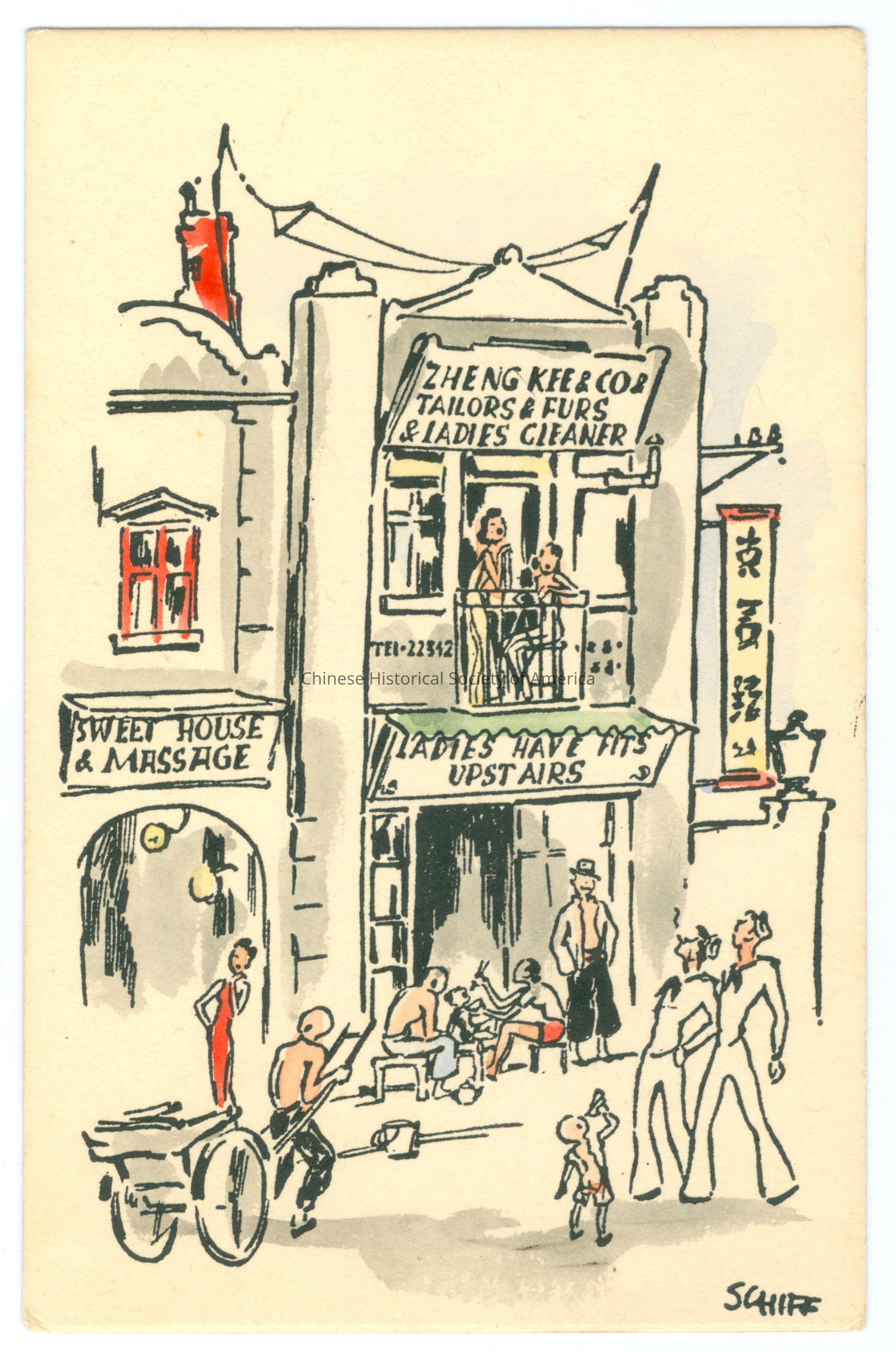 See CHSA-05025-05032. Front: Signs on the buildings of the cartoon: "Zheng Kee & Co & Tailors & Furs & Ladies Cleaner"; "Ladies have fits upstairs"; "Sweet House & Massage." "Schiff." Back: Info. Text: "Schiff's Sketches "Call of the East" Hand-Coloured Edition" "Copyright by Pacific Press Service, Shanghai, P.O. Box 824" Old Accession #: DNE