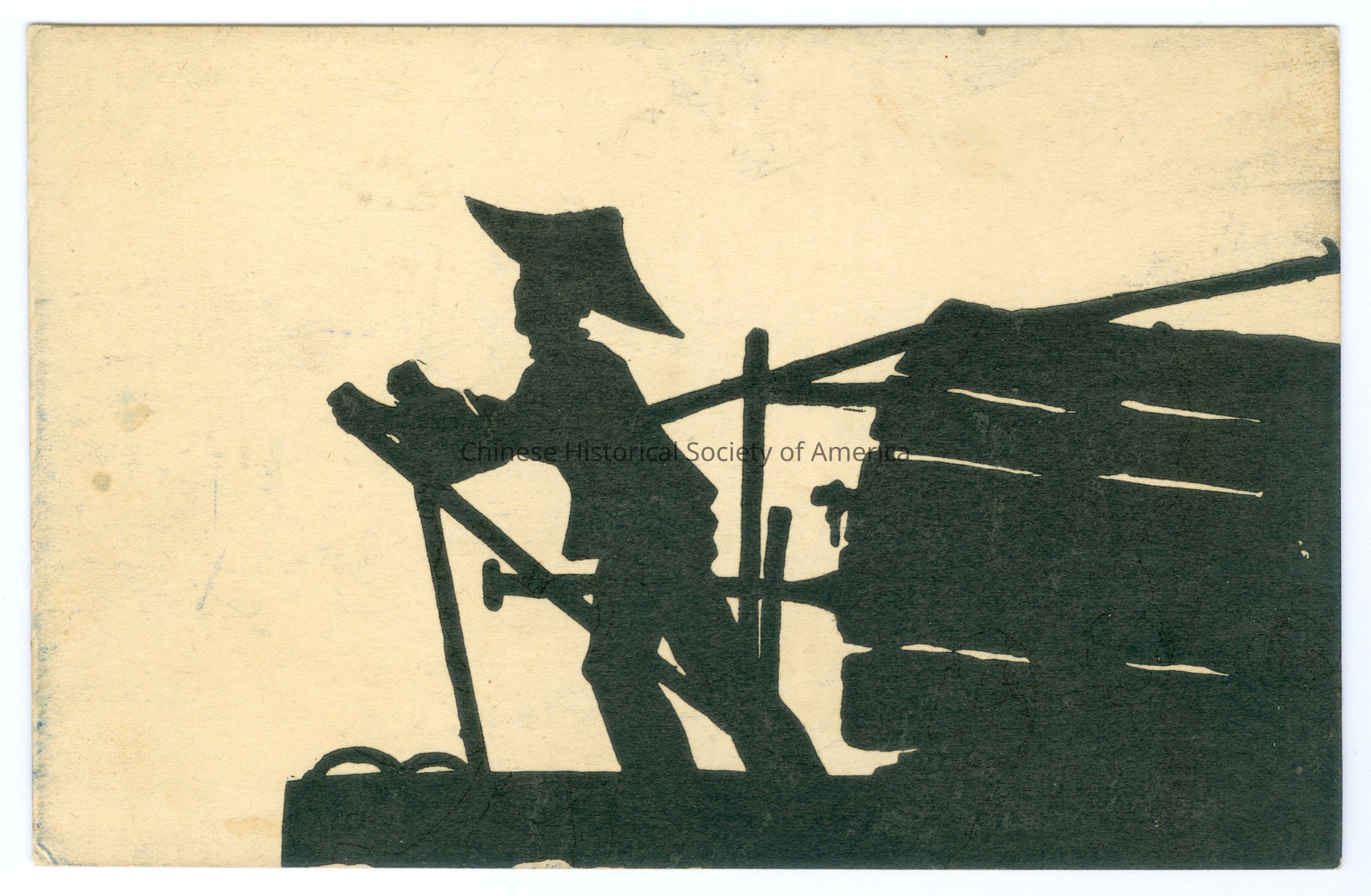 B&W. Silhouette. Silhouette Postcards; Boats: Silhouette of a man with a triangle hat that is on a boat that has a canopy on one end, he is standing and navigating the boat by steering a long wood pole.