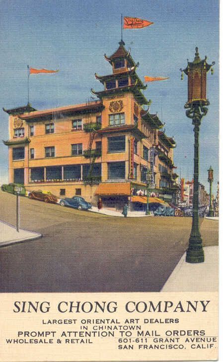Front: An illustration of the Sing Chong Company in San Francisco California that is located on Grant Avenue. The building is a four story building, with pagoda style roof. There are fire escape coming down one side of the building, and three orange flads with the Sing Chong label printed on it. The streets are empty except for the cars that are parked along it. Written on the bottom of the tradecard is the following: