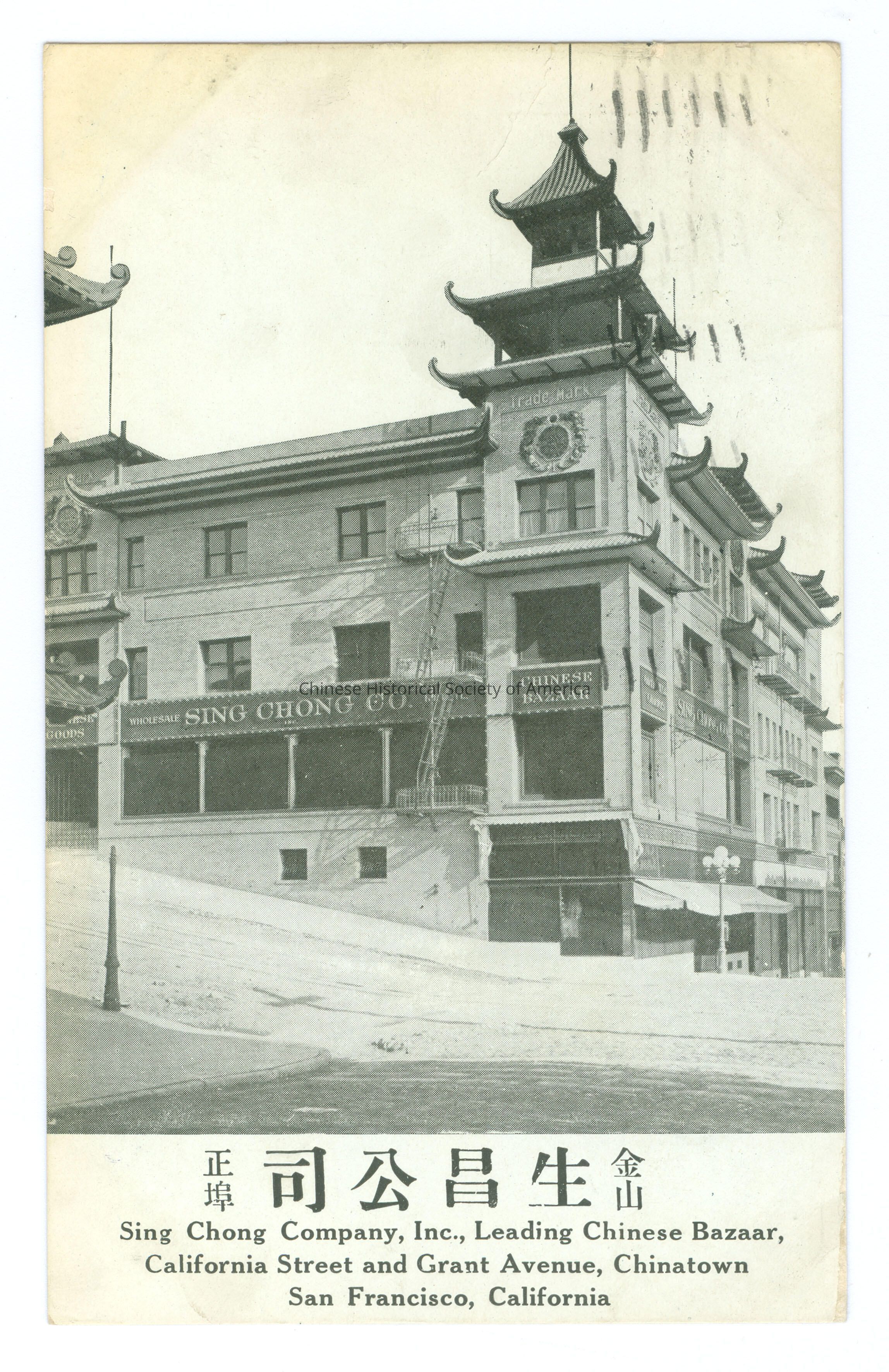 B&W. Photo. SF; Chinatown; Buildings; Sing Chong Co.: View of a corner building with a pagoda roof and the signs "Sing Chong Co.", "Chinese Bazaar" on it.