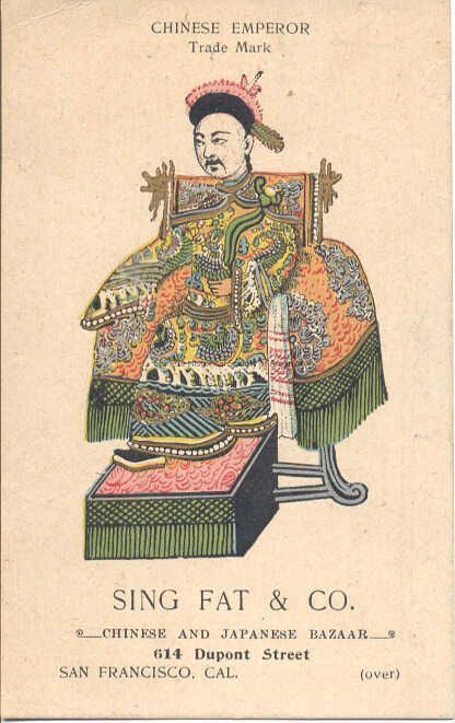 Front: At the center of this tradecard there is a Chinese man dressed in a traditional Asian gown in red, green, orange, and blue sitting in a chair with a foot rest. Written at the top of the tradecard is the following title: "Chinese Emperor Trade Mark" while at the bottom there is the following advertisement "Sing Fat & Co. Chinese and Japanese Bazaar- 614 Dupont Street San Francisco, Cal."