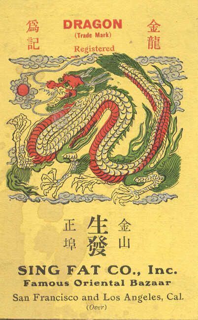 FRONT: Illustrated on a yellow tradecard is a red and green dragon in the center and the following advertisement:"Sing Fat Co., Inc. Famous Oriental Bazaar, San Francisco and Los Angeles, Cal." with Chinese characters written in red and black near the top of the tradecard and beneath the illustration of the green and red dragon.