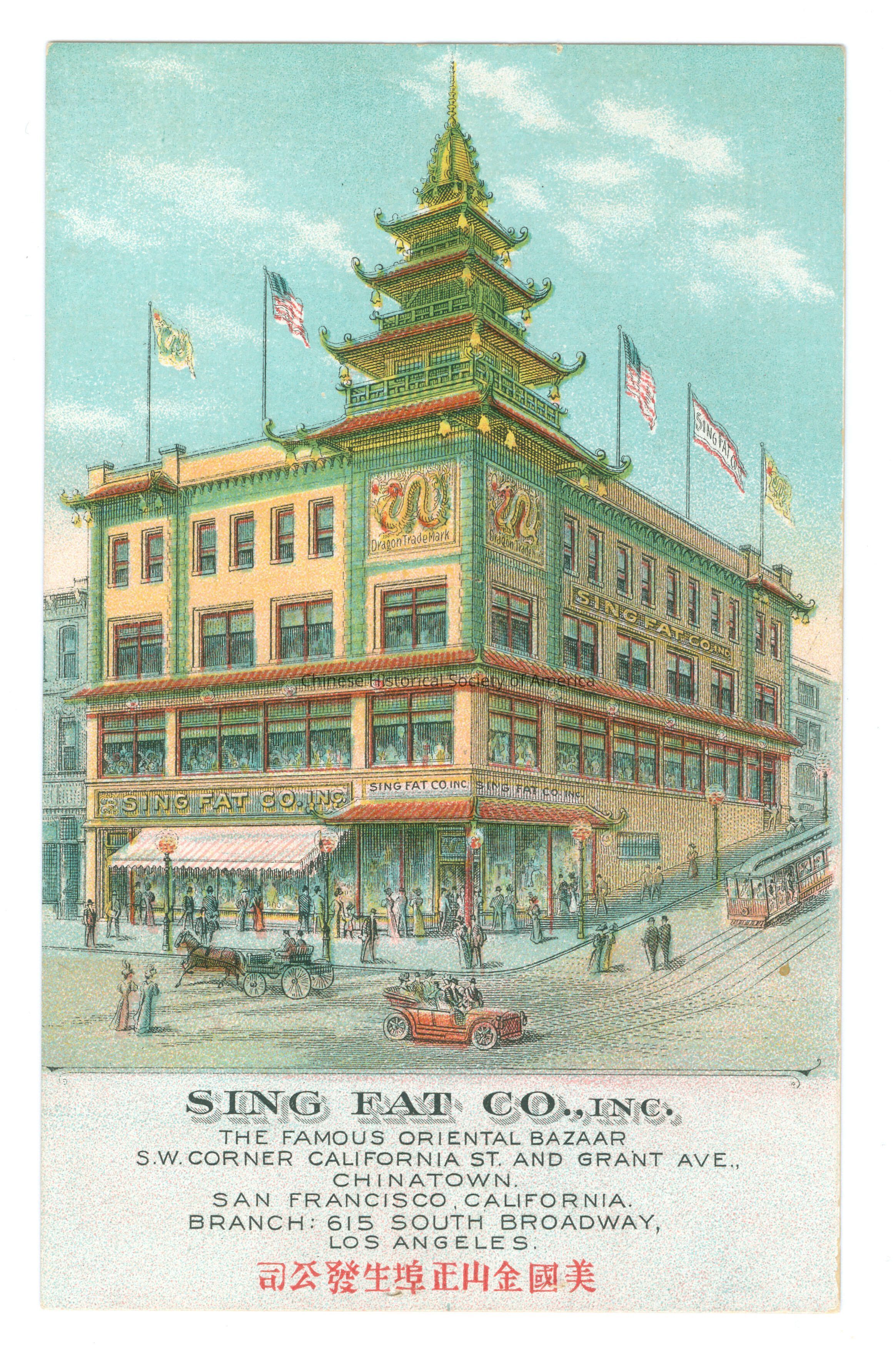 Front: Caption: "Sing Fat Co., Inc. The Famous Oriental Bazaar, S.W. corner California St. and Grant Ave., Chinatown. San Francisco, California. Branch: 615 South Broadway, Los Angeles." Back: There is a stamp with a dragon symbol, "Dragon Trade Mark Registered." Britton & Rey Lithographers, S.F. Publishers of Pictorial Postcards.