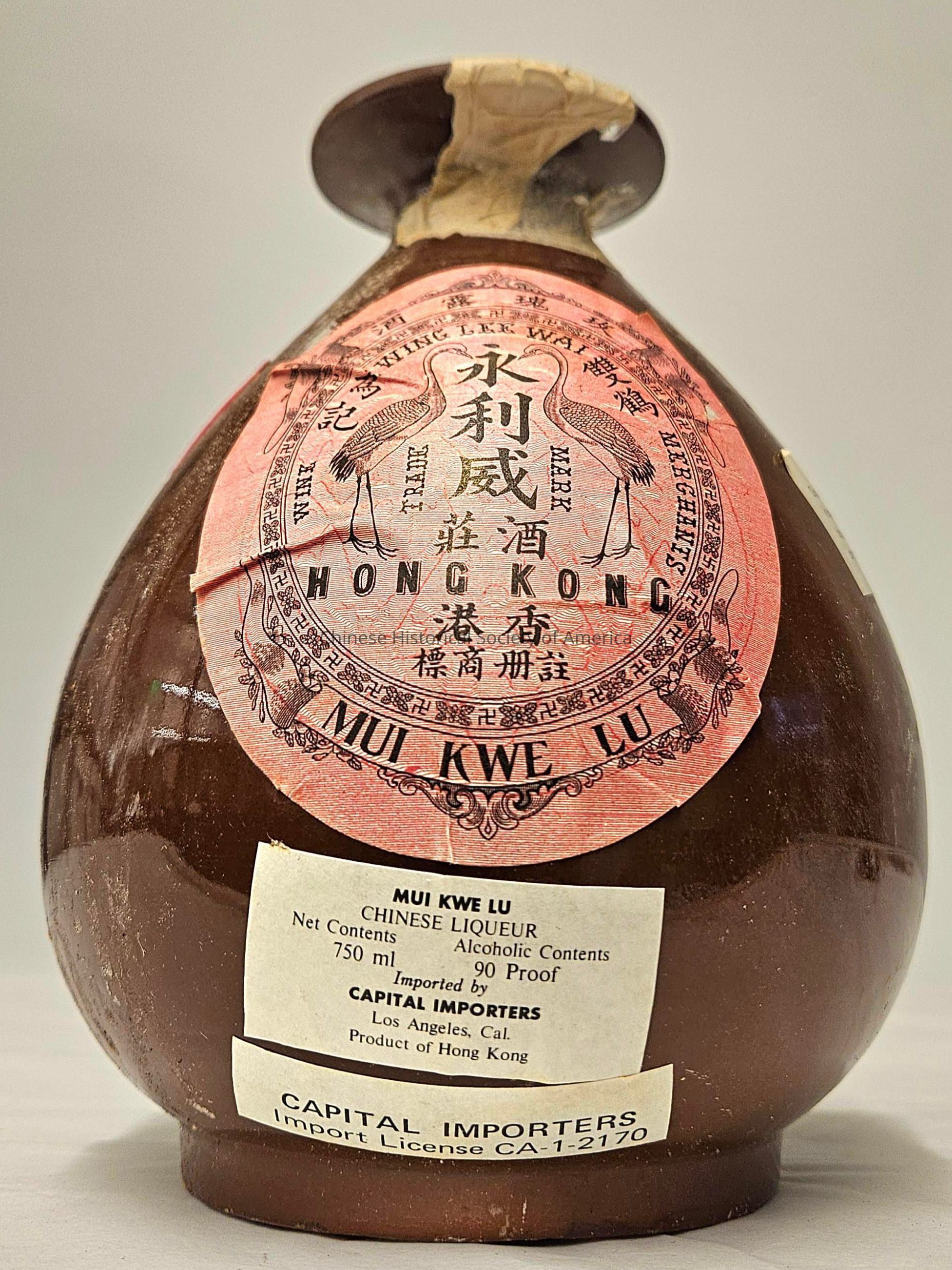 Brown bottle with rich pink label Hong Kong trademark Mui Kwe Lu, jar and cork are a-b.