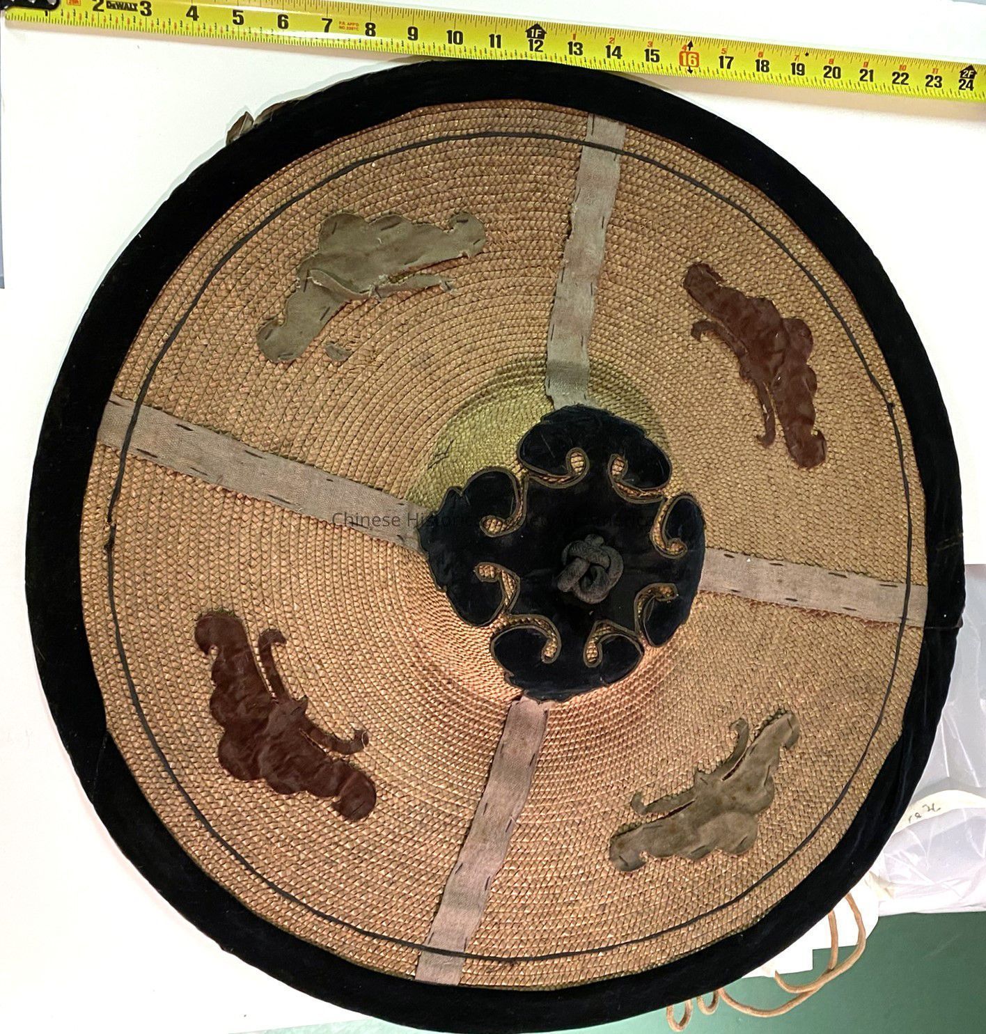 Chinese Straw Hat from Marysville, CA. There are four fabric cutouts of bats (two brown and two grayish/beige), sewn around the top of the brim. There are gray strips of fabric sewn across the hat, dividing it into four sections, when viewed from above. On the top of the crown there is a black, fabric design, that has four organic patterns, each with a point that aligns with the gray strips of fabric. The brim is lined with a strip of black fabric. There is a grayish-beige fabric that lines the underside of the brim. There are two orange colored fabric strips and a thick string, presumably for chin straps. All the decorative fabrics are sewn on by hand, and the stitches are visible throughout. The crown's underside has exposed straw. 68-36.
