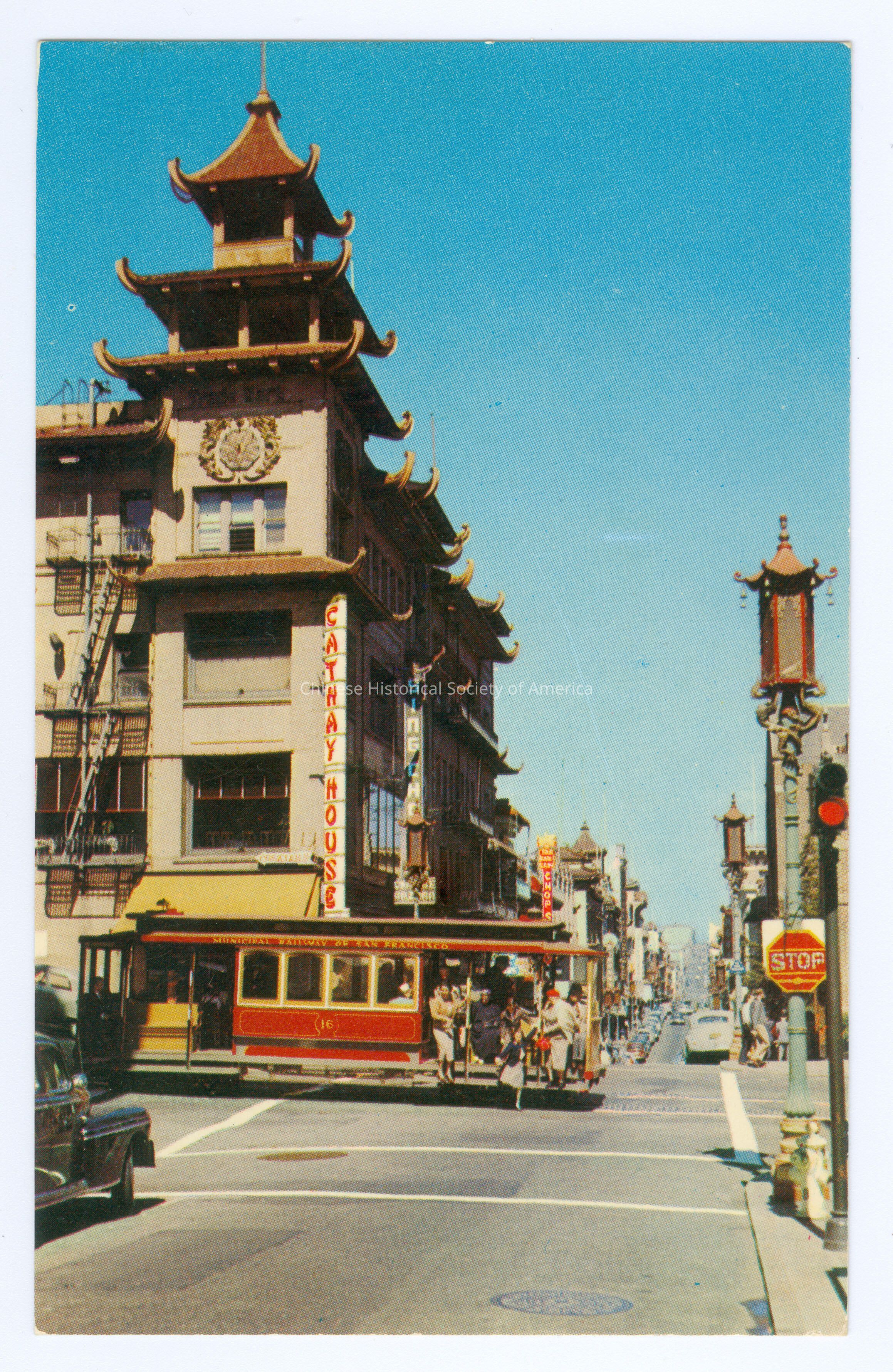 Color. Photo. SF; Chinatown; Buildings; Sing Chong Co.: View of the corner building with pagoda roofs that has a sign "Cathay House", and "Sing Chong Co." on it with a cable car full of people passing in front.