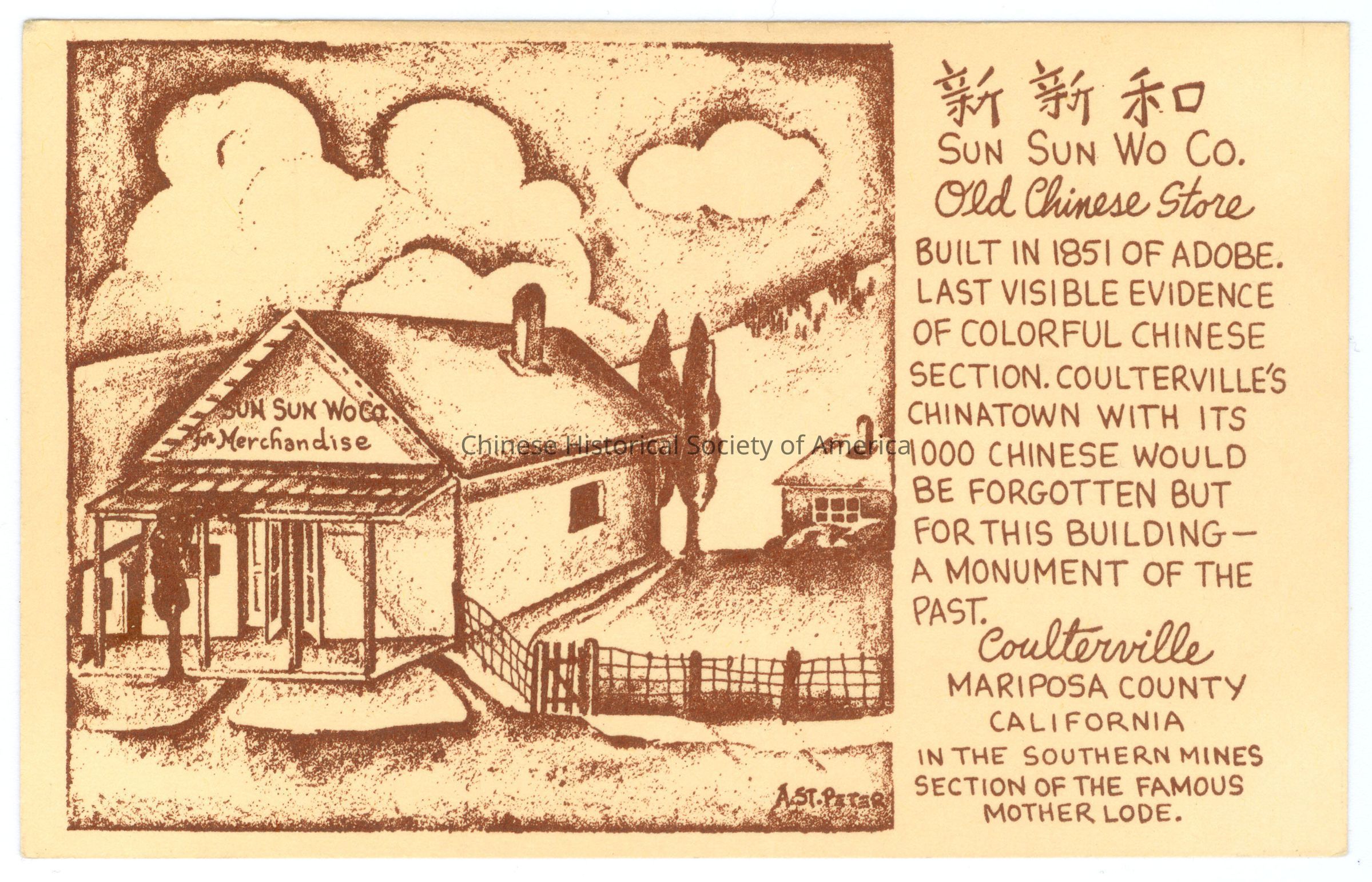 Front: Picture: "A.ST.Peter", on the bottom corner of the illustration. Text: "Sun Sun Wo Co. Old Chinese Store Built in 1851 of Adobe. Last visible evidence of colorful Chinese section. Coulterville's Chinatown with its 1000 Chinese would be forgotten but for this building--a monument of the past. Coulterville, Mariposa County, California, In the southern mines section of the famous mother lode." Back: Message: "Vacation--1957, bought some old stamped post cards here," handwritten in black ink.