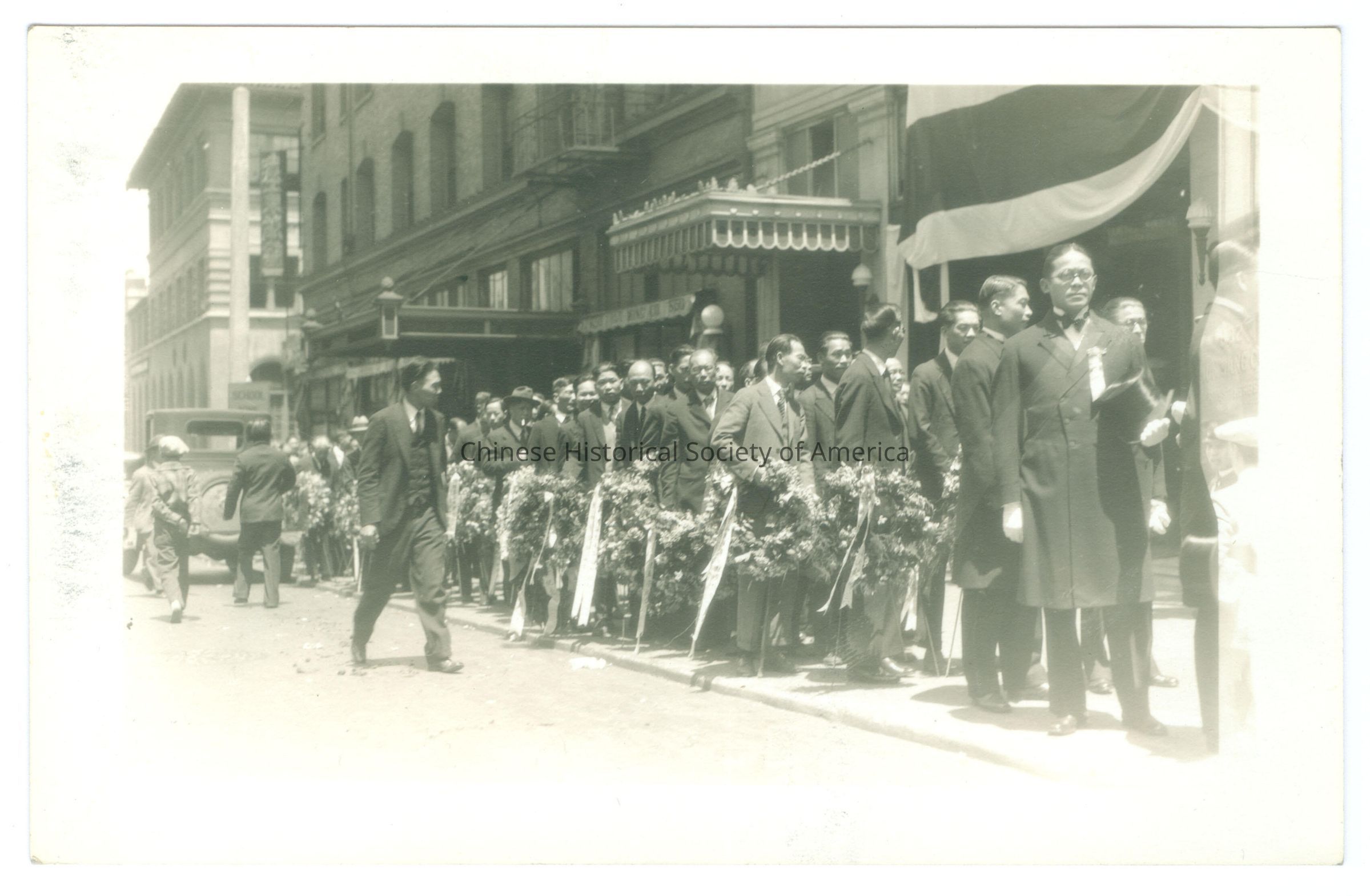 B&W. Photo. SF; Sun Yat Sen Funeral Procession: Rows of men in suits without hats are lined up on the sidewalk in front of a building holding a wreath of flowers.