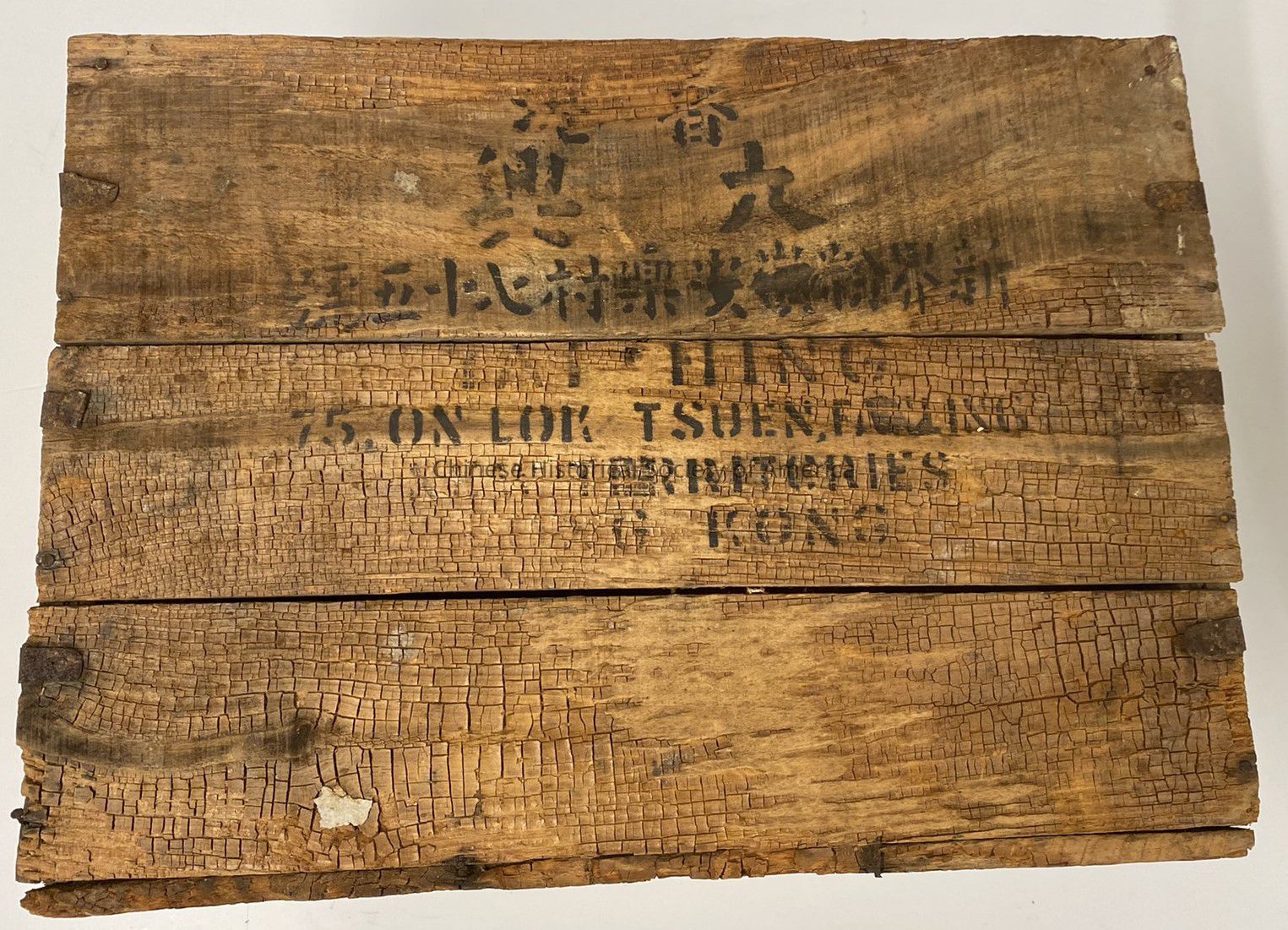 Wood crate with stamp which reads, "Tai-Hing 75 On Lok Tsuen, F[anl]ing/Territories of [Hon]g Kong".
